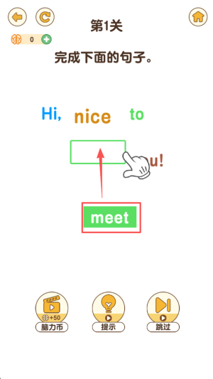 2、在第1关中,拖动单词“meet”完成句子“Hi, nice to meet you!”。