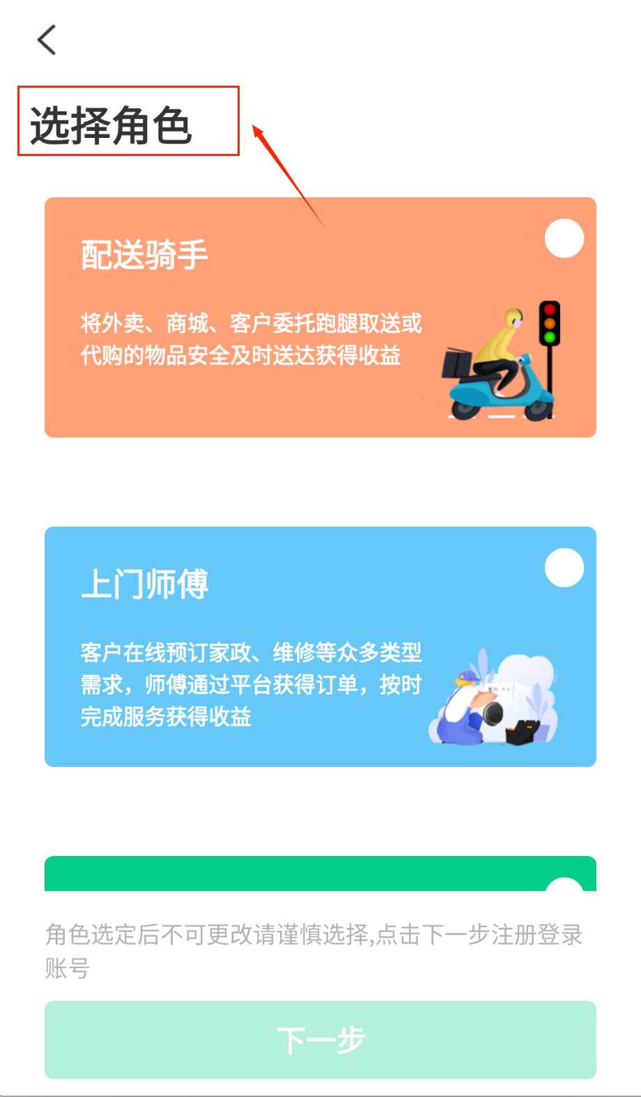 1、打开软件先看欢迎页的角色选择呢,配送骑手和上门师傅选一个合适的,点下一步才能继续注册哦。