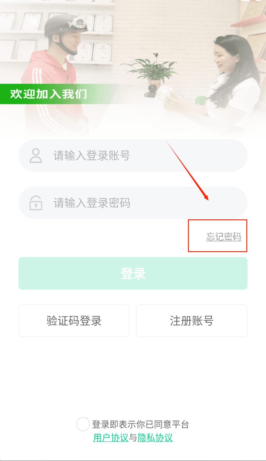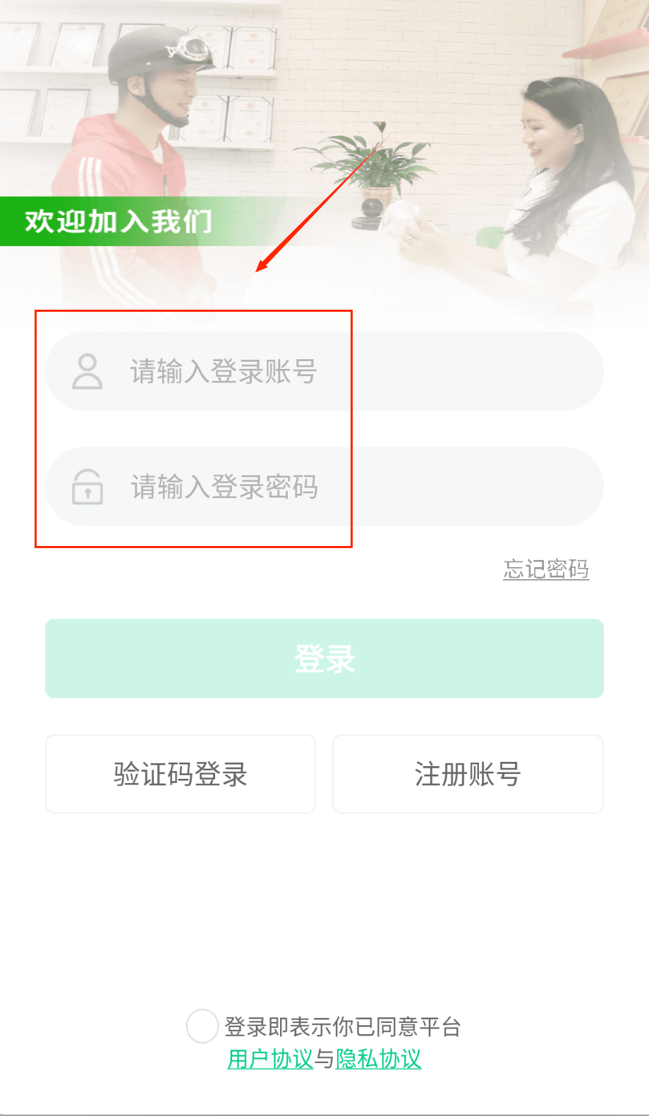 3、验证码和密码输入完要核对一遍,勾选同意协议再点登录,绿色按钮挺显眼的别漏了这一步。
