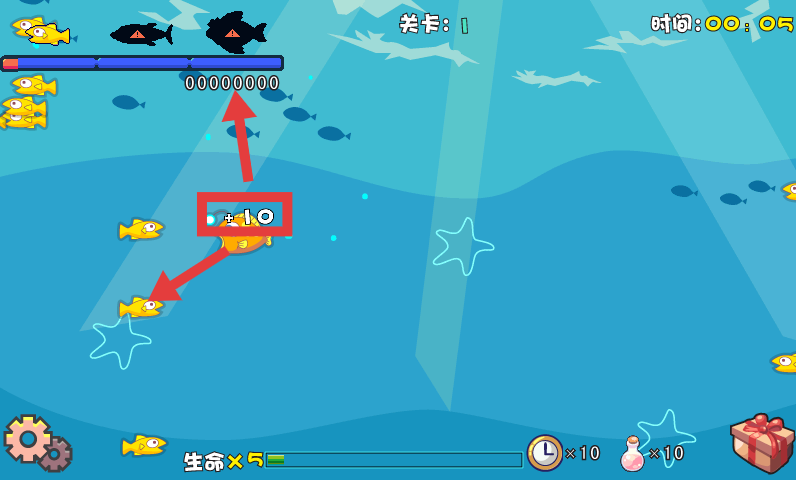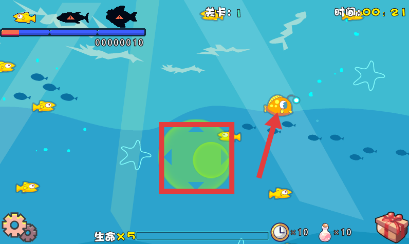 2、进入【关卡1】后,通过滑动虚拟方向键操纵场景中的灯笼鱼吃掉其他小黄鱼,留意生命与时间条,快速积累目标。