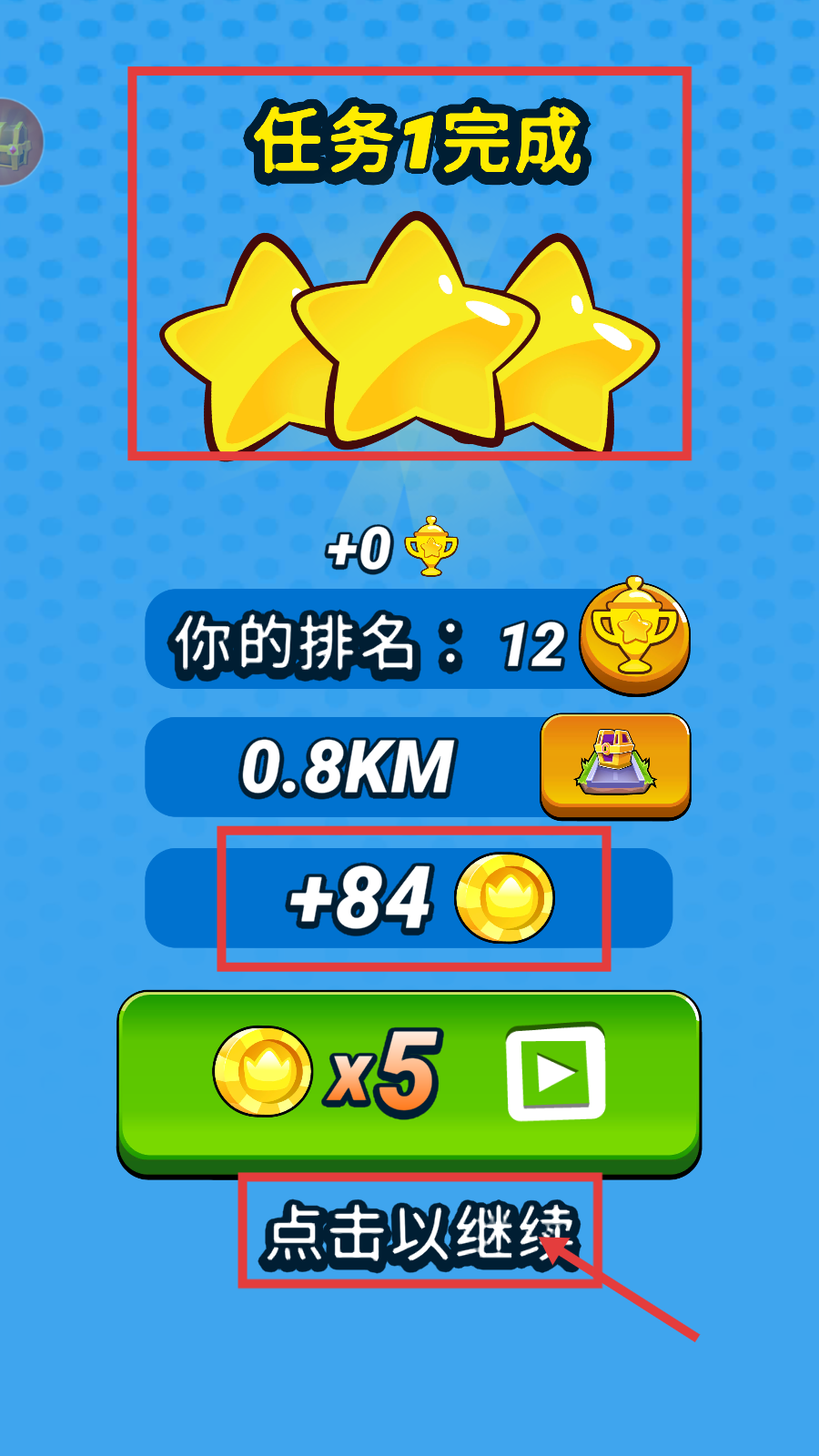 4、任务达成后,确认【+84】金币奖励,点击【点击以继续】进入下一环节。