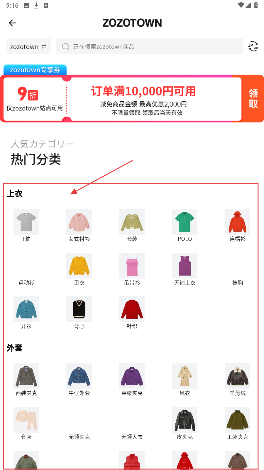 2、在【ZOZOTOWN】页,先领券,再从热门分类【上衣】找心仪款式。