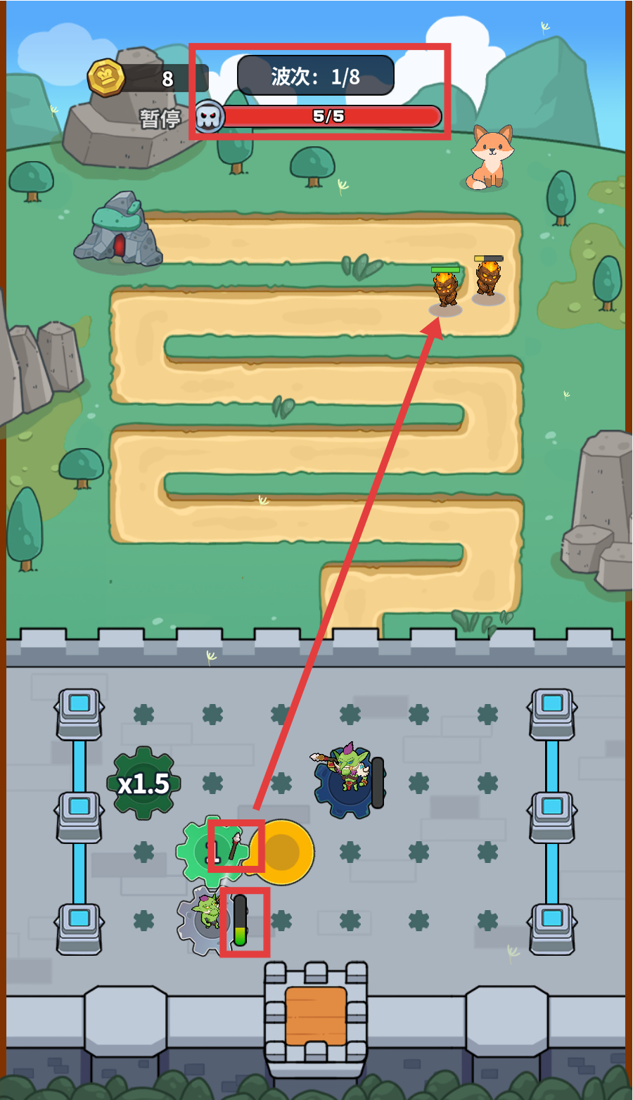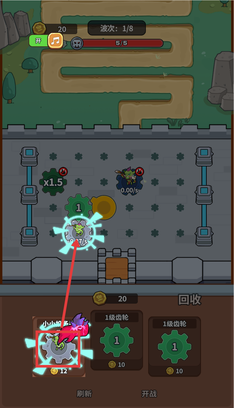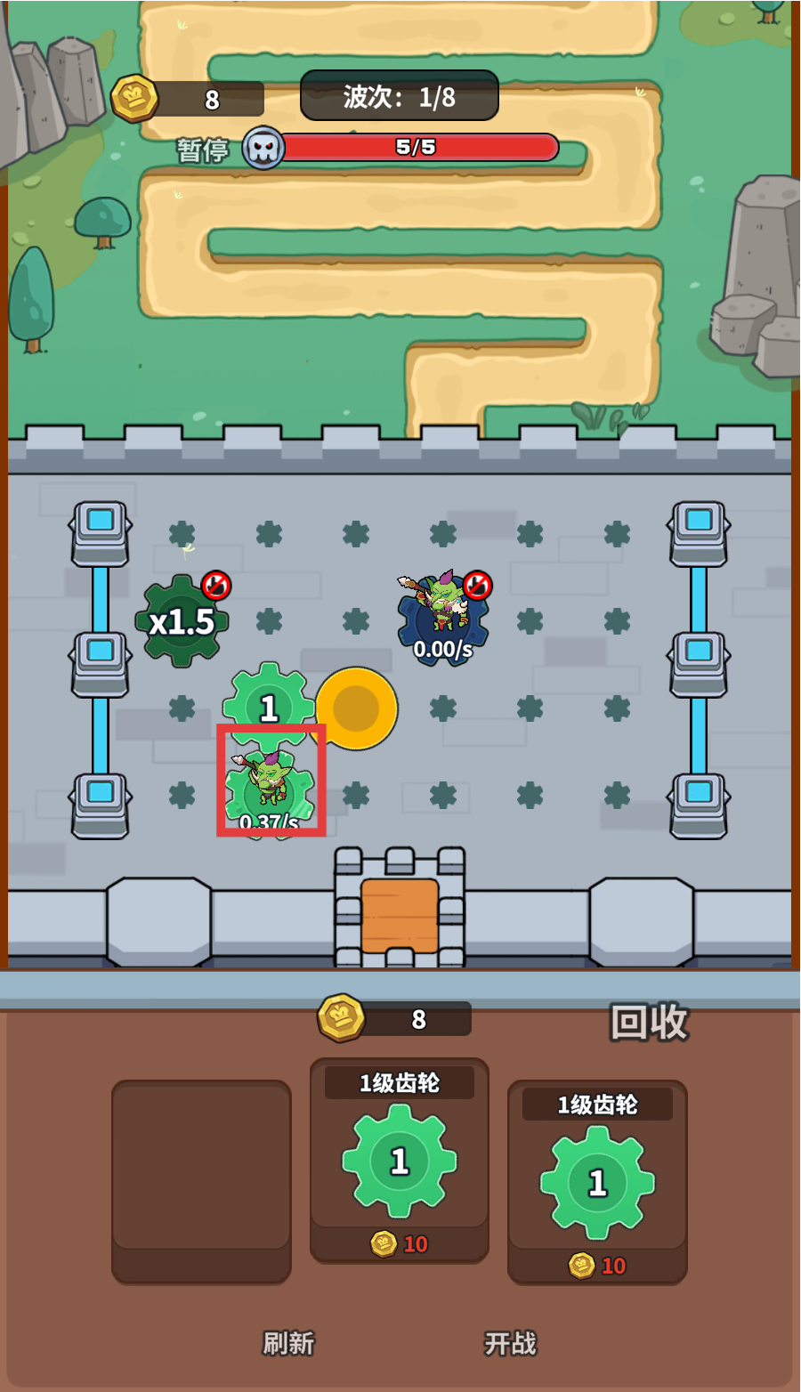 1、波次-1/8时,观察怪物路径,优先在关键位置部署【1级齿轮】,借助攻速提升输出效率。