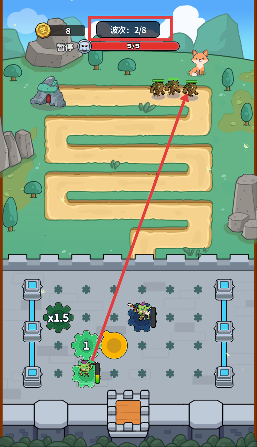 4、波次-2/8来袭,怪物数量增多,依托已部署防御,关注输出节奏,适时调整策略抗敌。