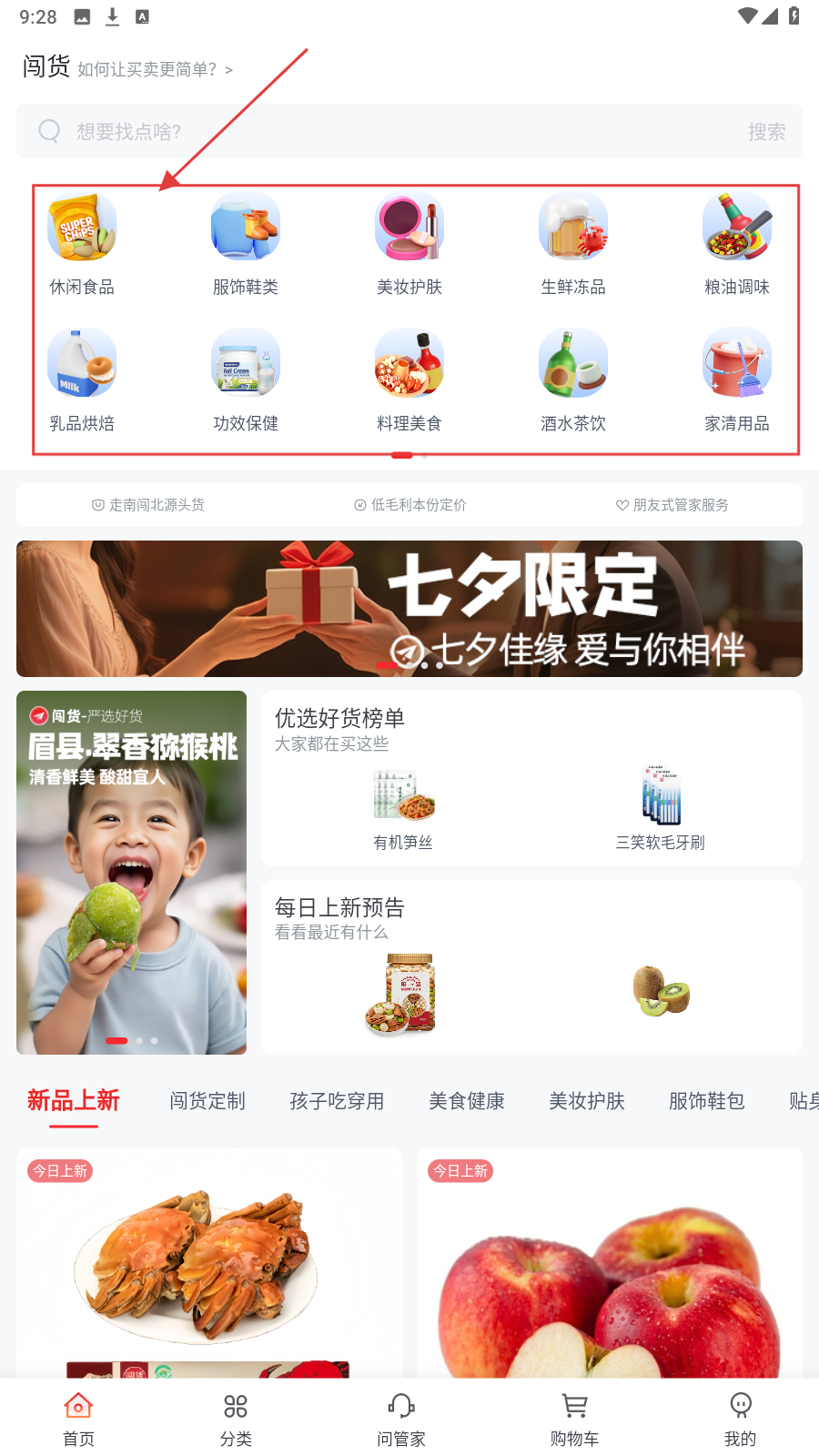 1、进入首页,点击【休闲食品】分类,快速找到零食相关商品。