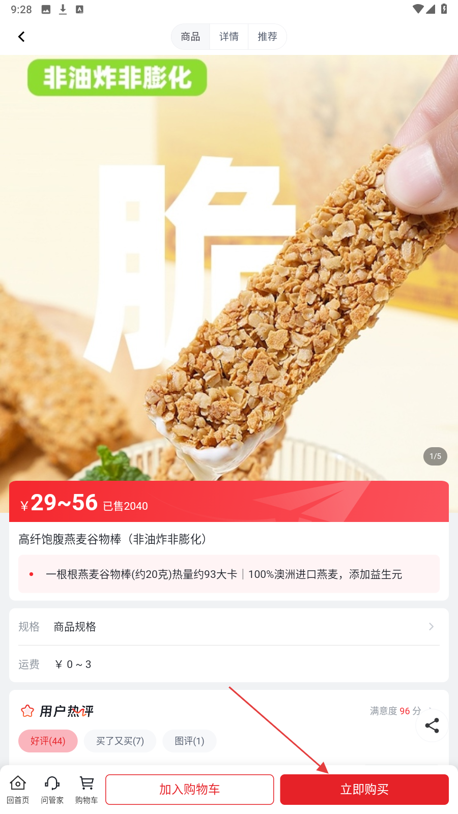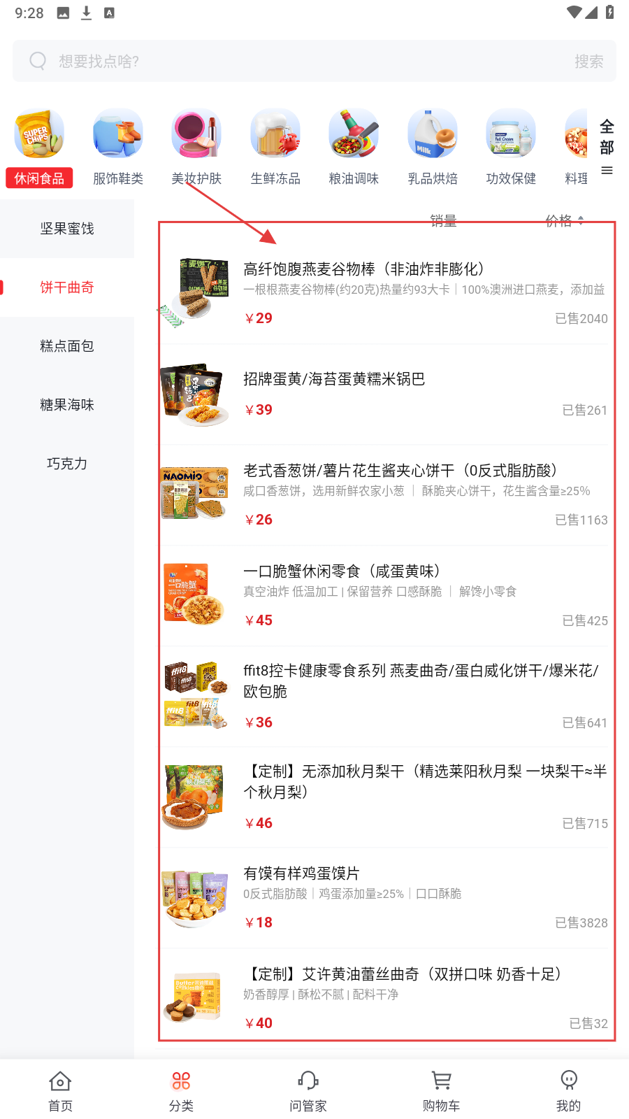 2、在【休闲食品】分类页,浏览商品列表,挑选心仪零食,如高纤燕麦谷物棒。