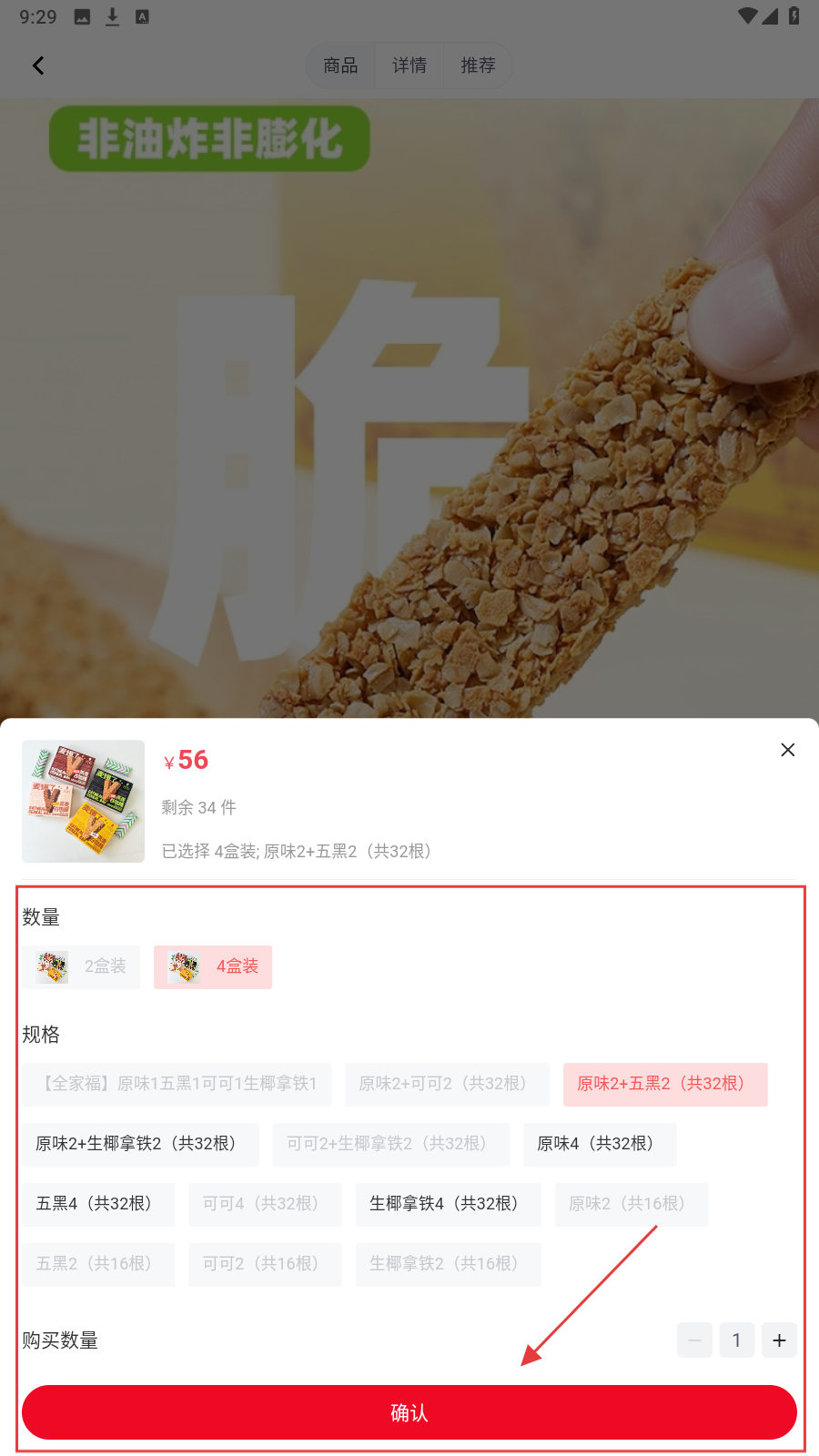 4、选择商品数量、规格,点击【确认】,完成购买信息选定。
