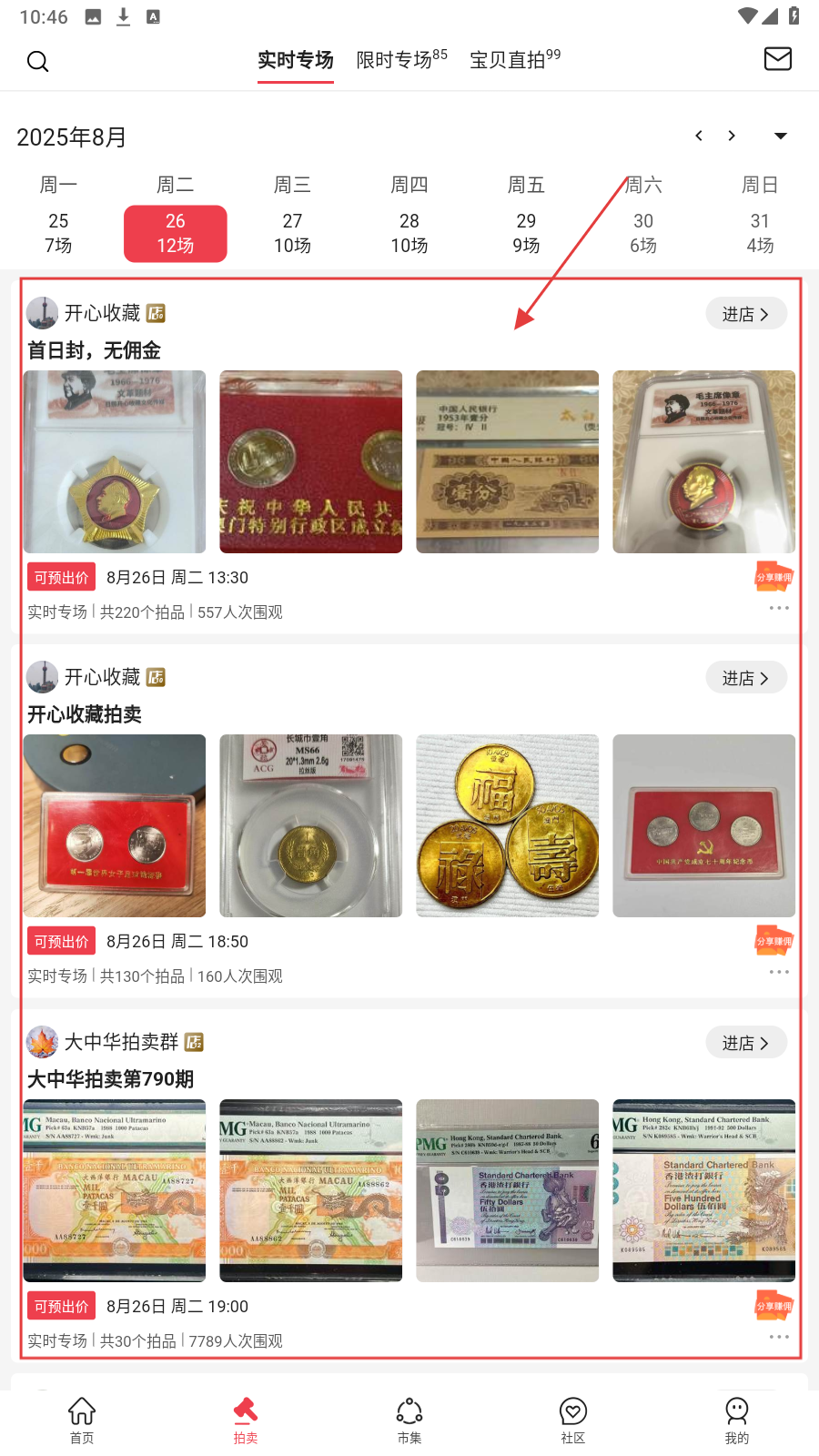 1、进入首页,点击【实时专场】,快速进入拍卖专场选品环节。
