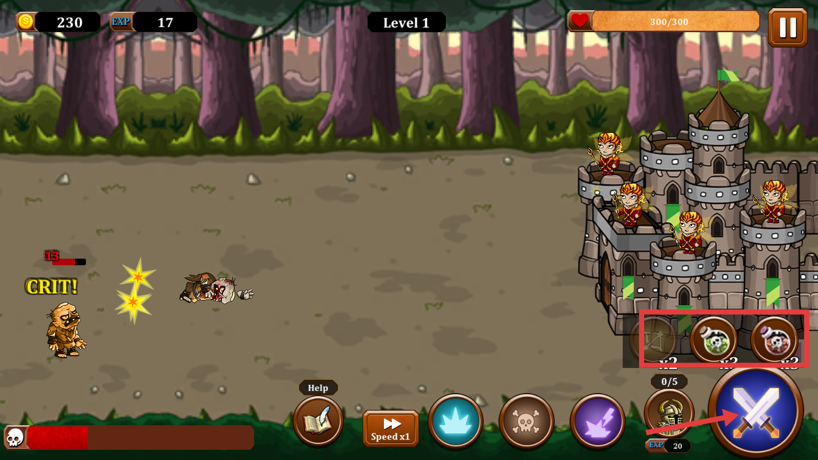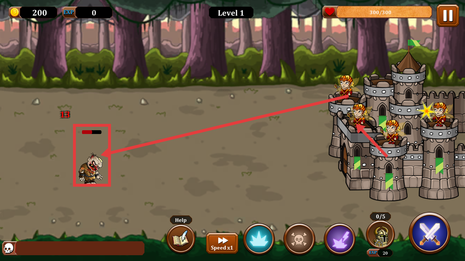 2、Level-1阶段,依托城堡角色攻击靠近怪物,守护【300/300】血量,积累金币与经验。