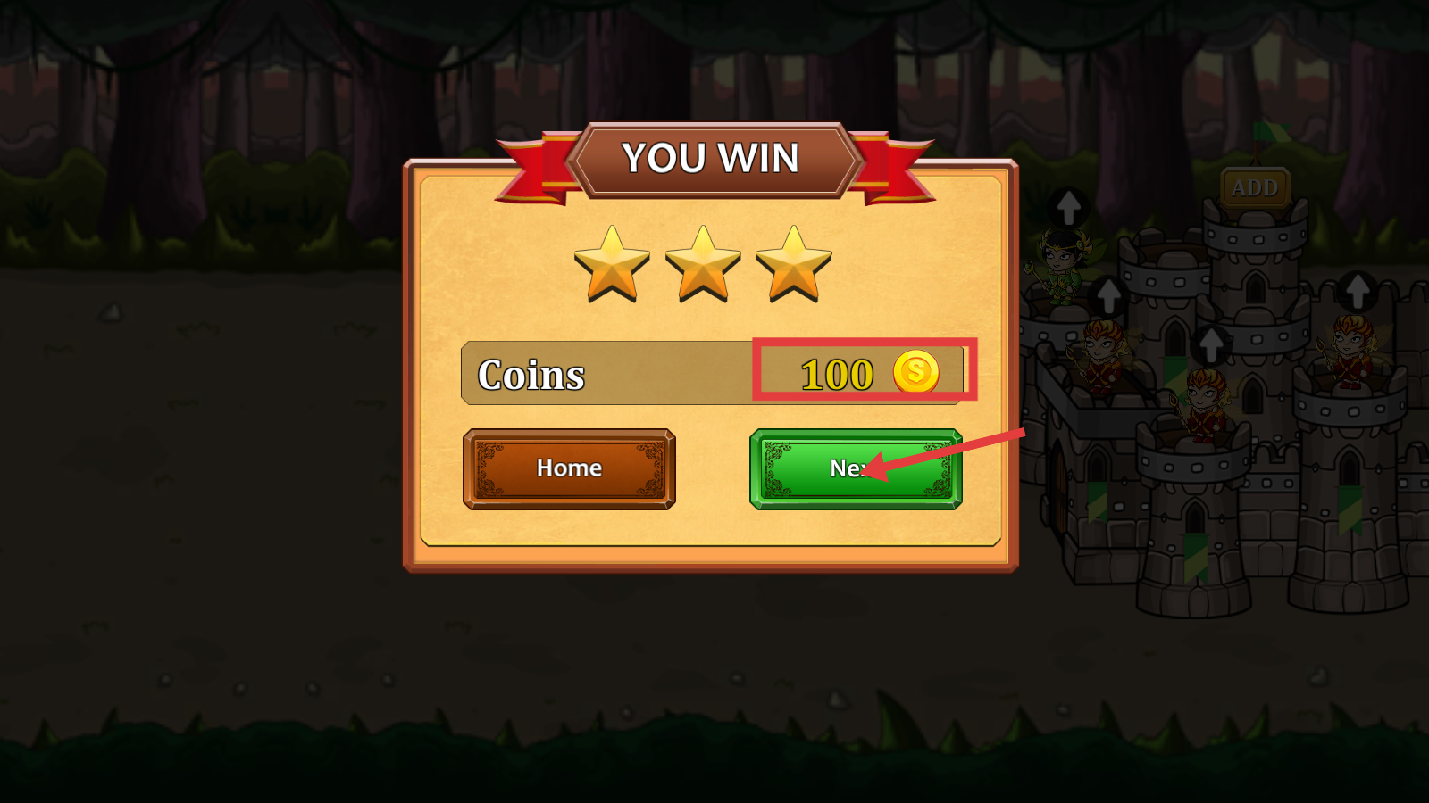 4、通关领取【100】金币,点击绿色【Next】按钮,推进至下一关,解锁World-1新挑战。