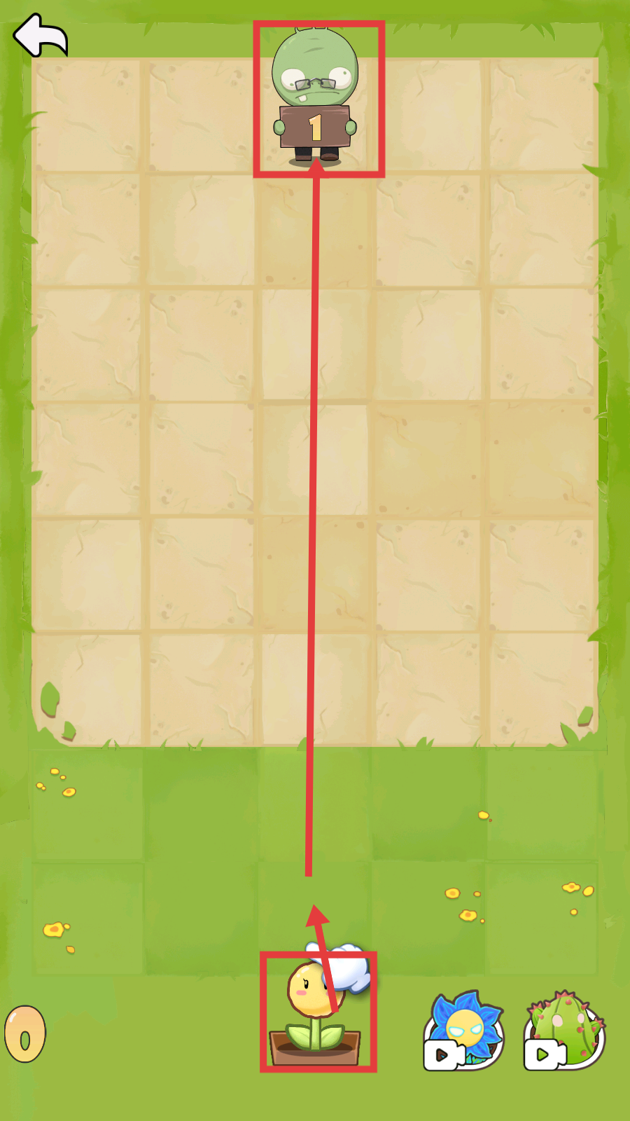 2、战斗界面底部部署植物,瞄准上方【持牌-1号僵尸】攻击,构建首道防御线。