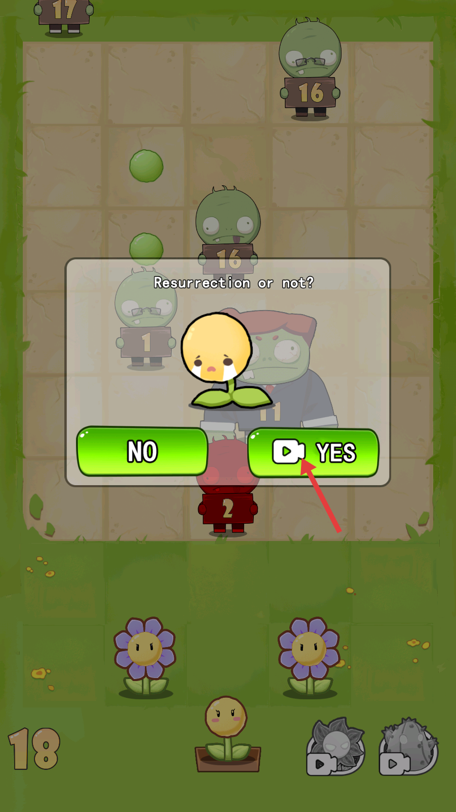 4、失败后遇【Resurrection-or-not?】弹窗,点【YES】看广告复活,继续挑战僵尸。