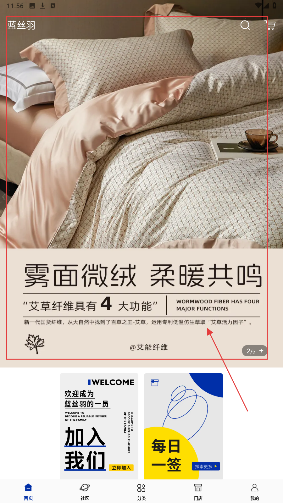 1、逛【蓝丝羽】首页,留意床品海报,了解“艾草纤维”等特色材质床品信息。