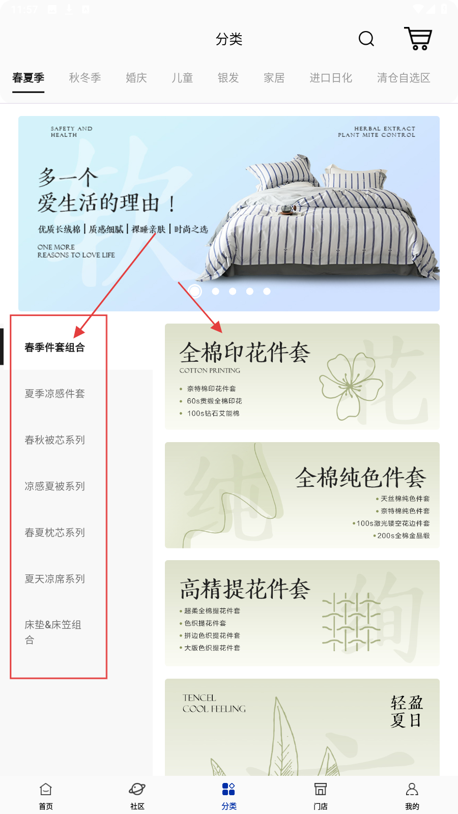 3、进入【分类】页,选“春季件套组合”等分类,精准找对应季节床品。