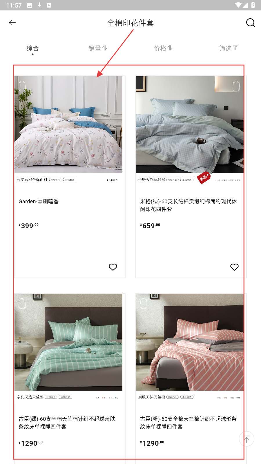 4、浏览【全棉印花件套】列表,对比“Garden幽幽暗香”等款式,挑喜欢的床品。