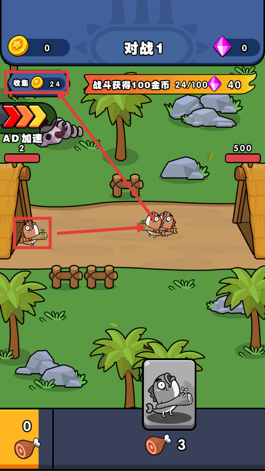2、消耗【鸡腿-3】召唤下方单位,派遣至中路抗敌,借助【AD加速-2】提升作战效率。