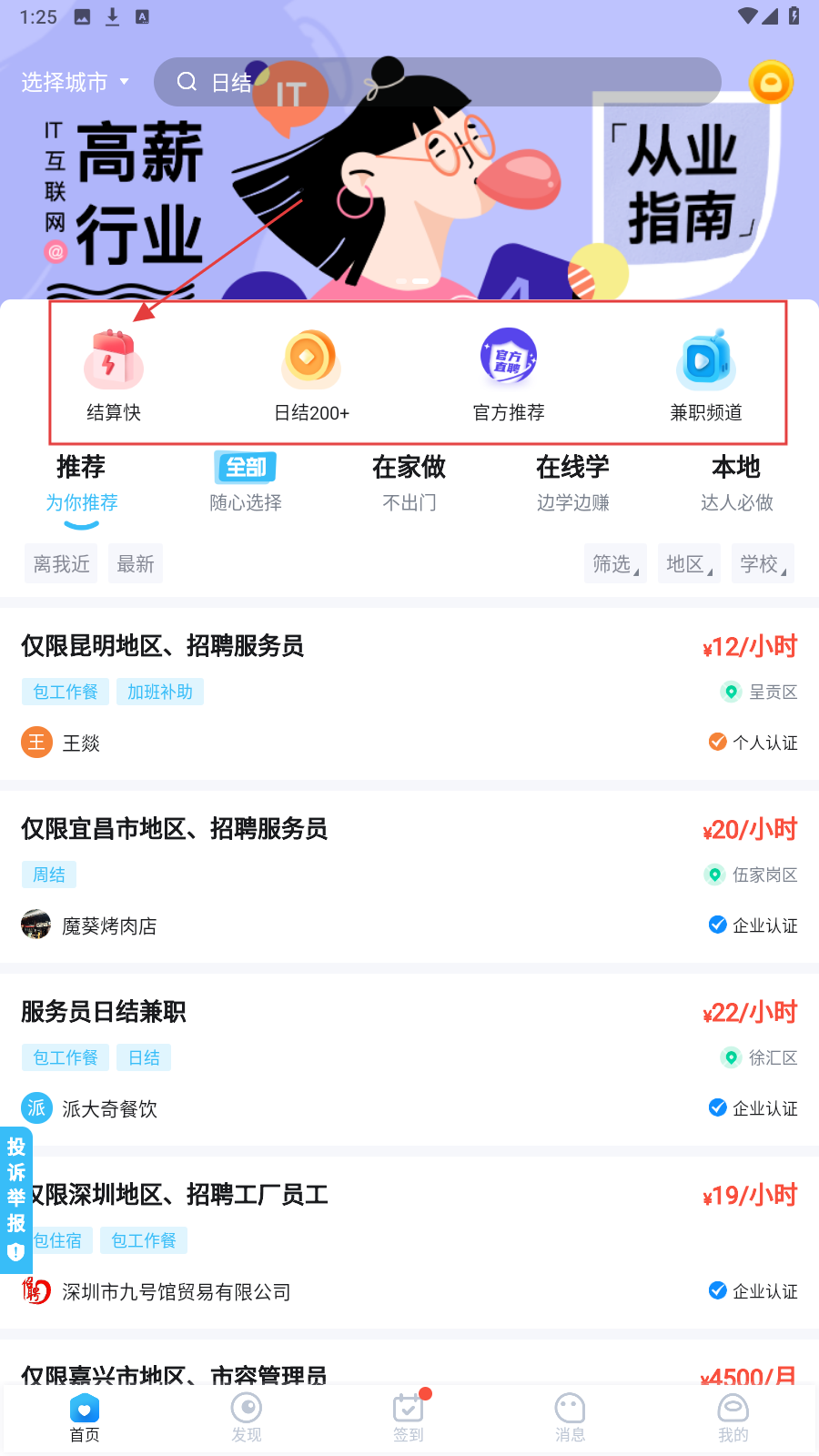 1、打开应用,首页选【结算快】标签,筛出日结/快速结算岗位。