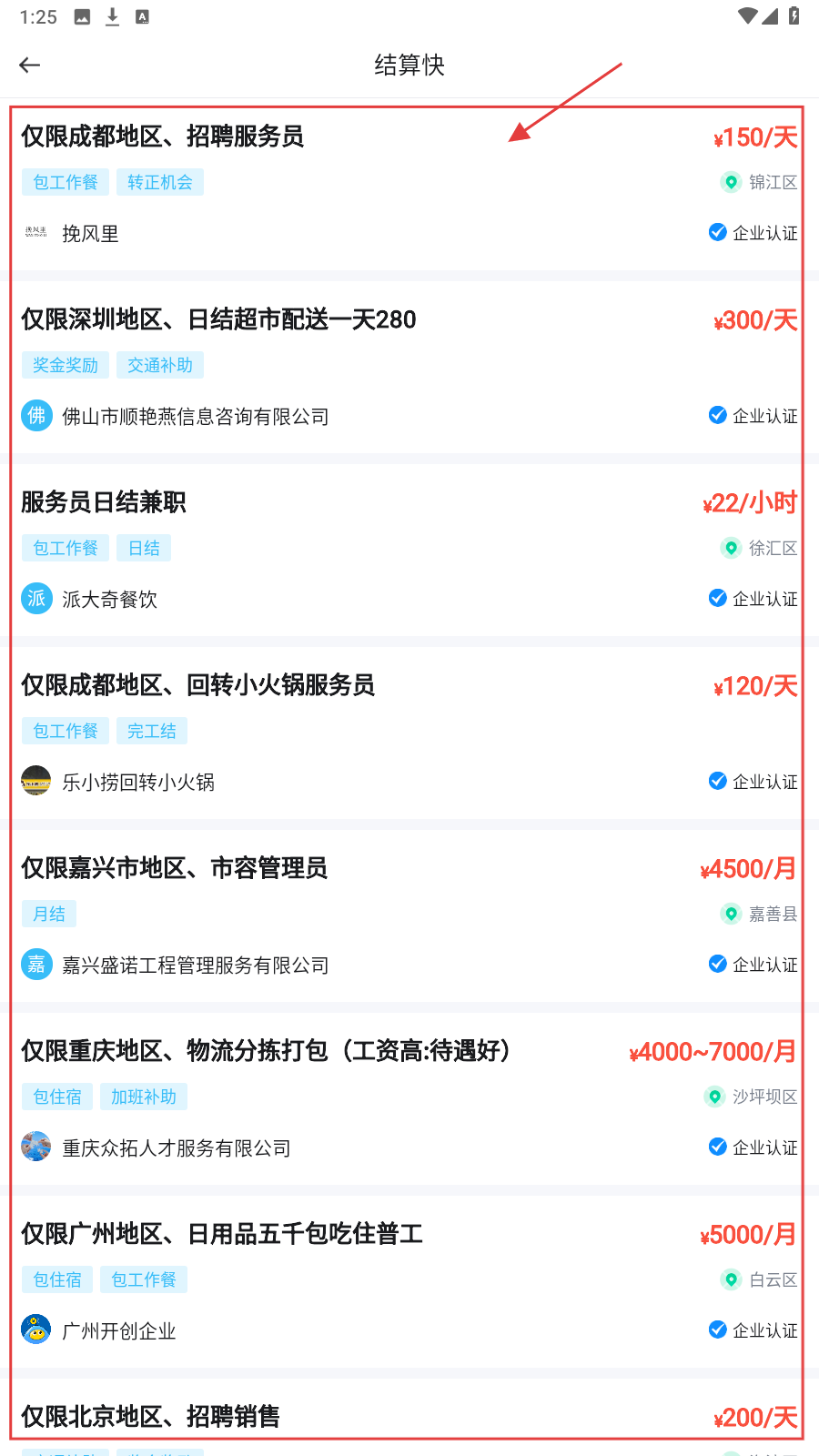 2、进入【结算快】列表,浏览岗位信息,挑符合需求的点进去看详情。