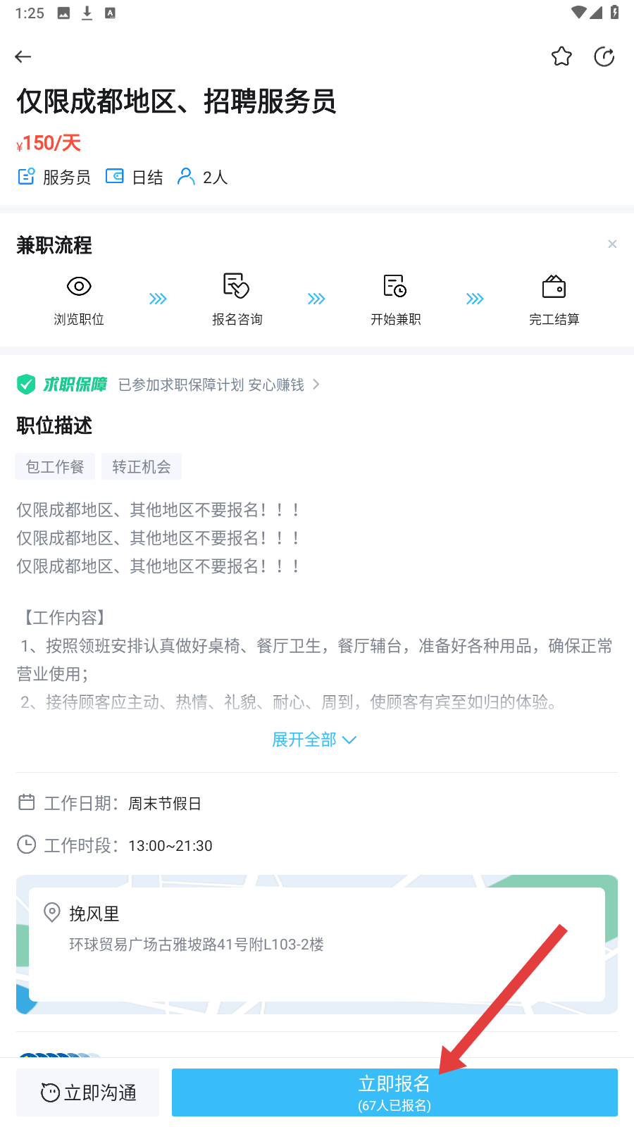 3、查看岗位详情,确认工作内容、时间等,点【立即报名】参与应聘。
