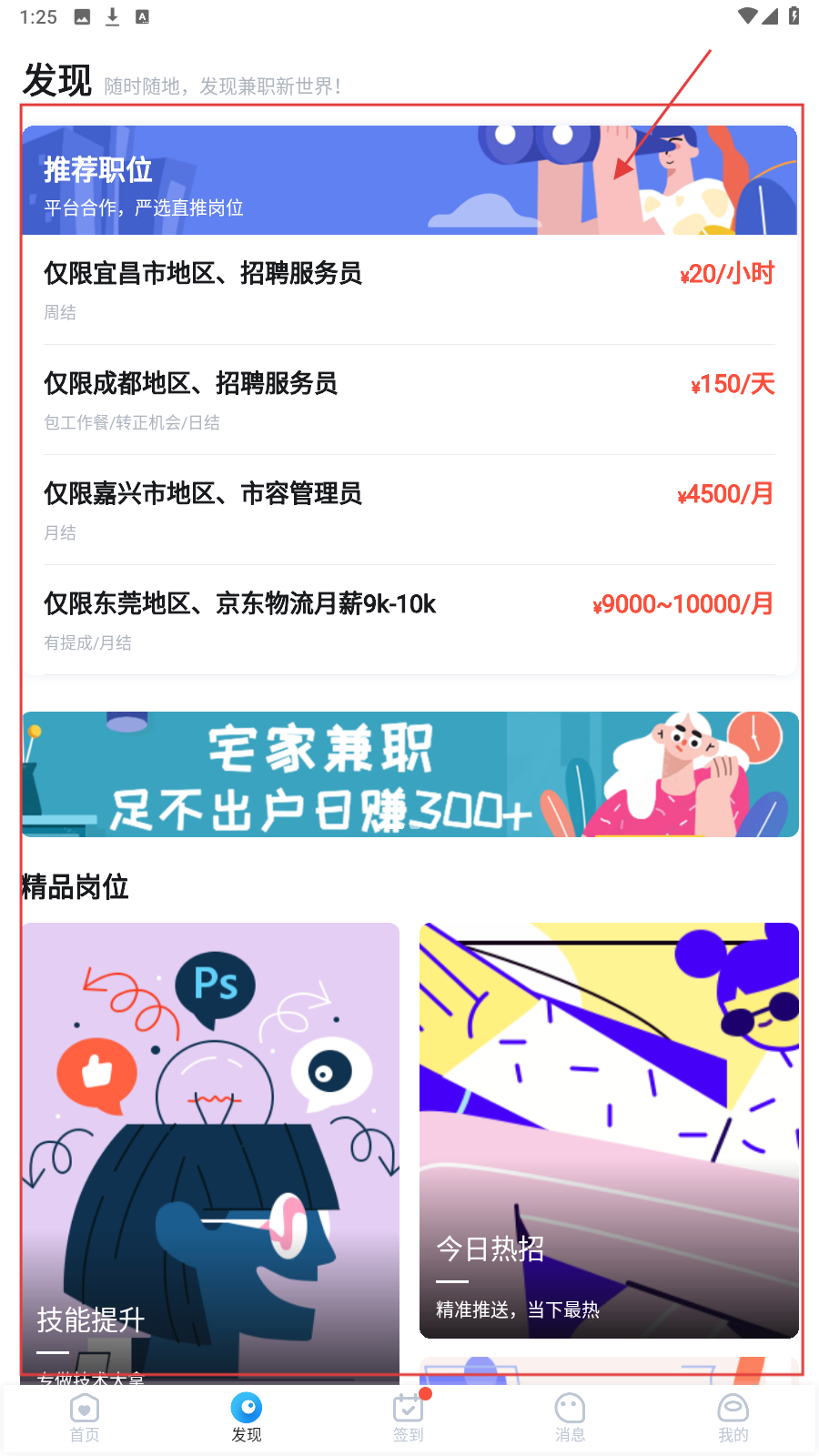 4、切换到【发现】页,逛【推荐职位】【精品岗位】,挖掘更多优质兼职。