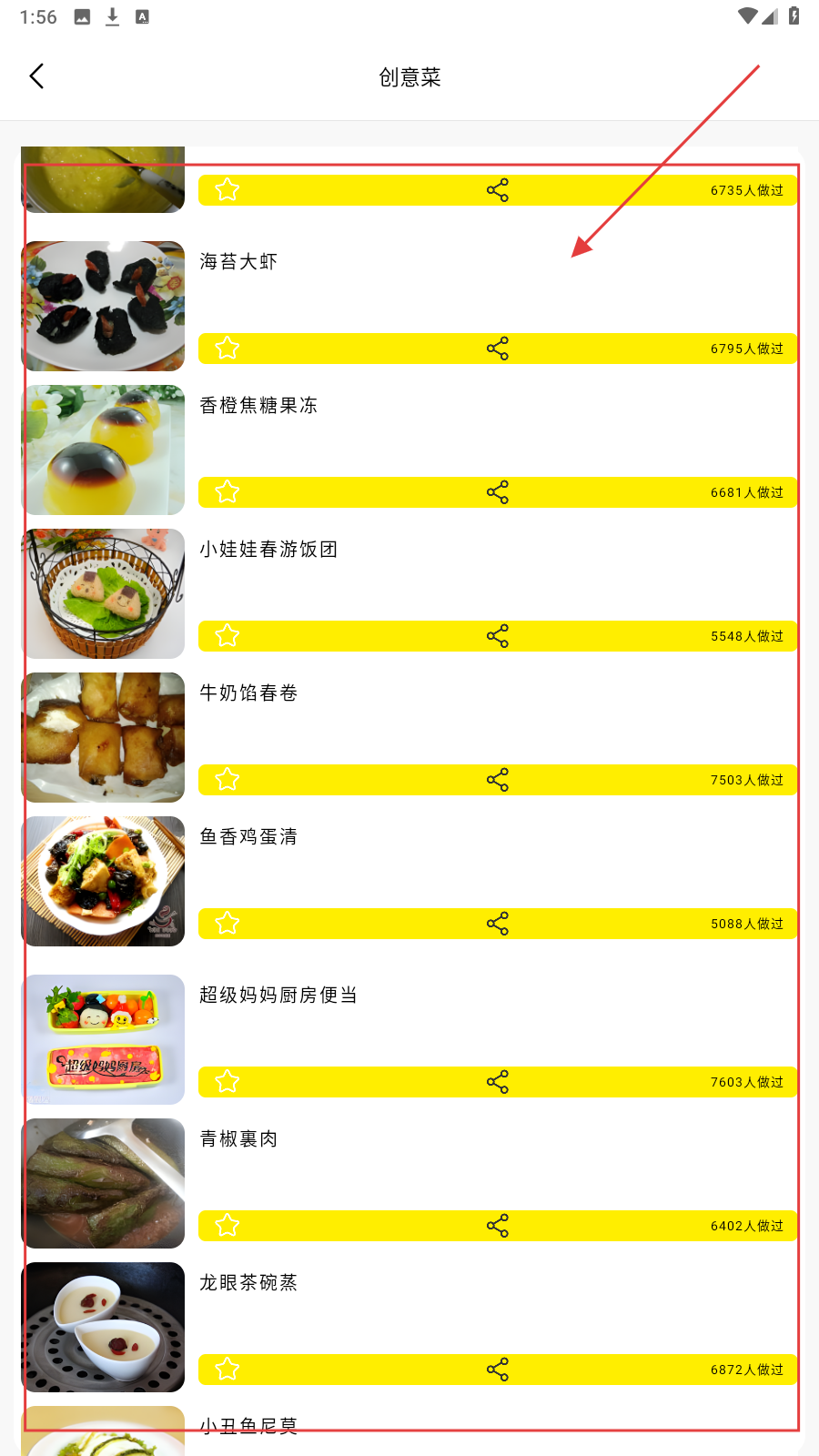 1、进入【菜谱】页,点【周美食-创意菜】板块,浏览创意菜合集。