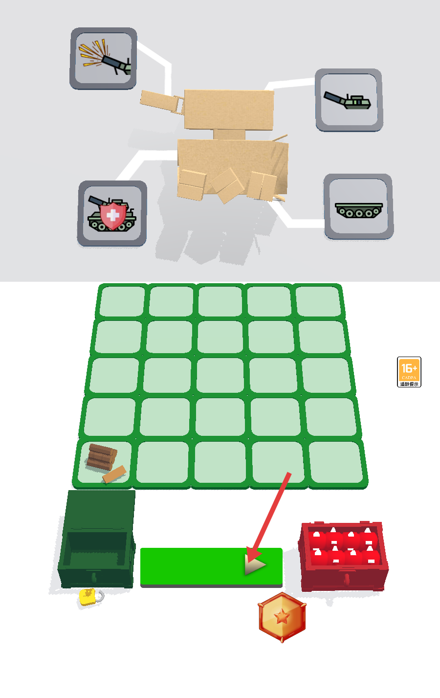 1、组装战车时,挑选【武器】【防御】等零件,拖放至网格,点击绿色区域启动搭建。