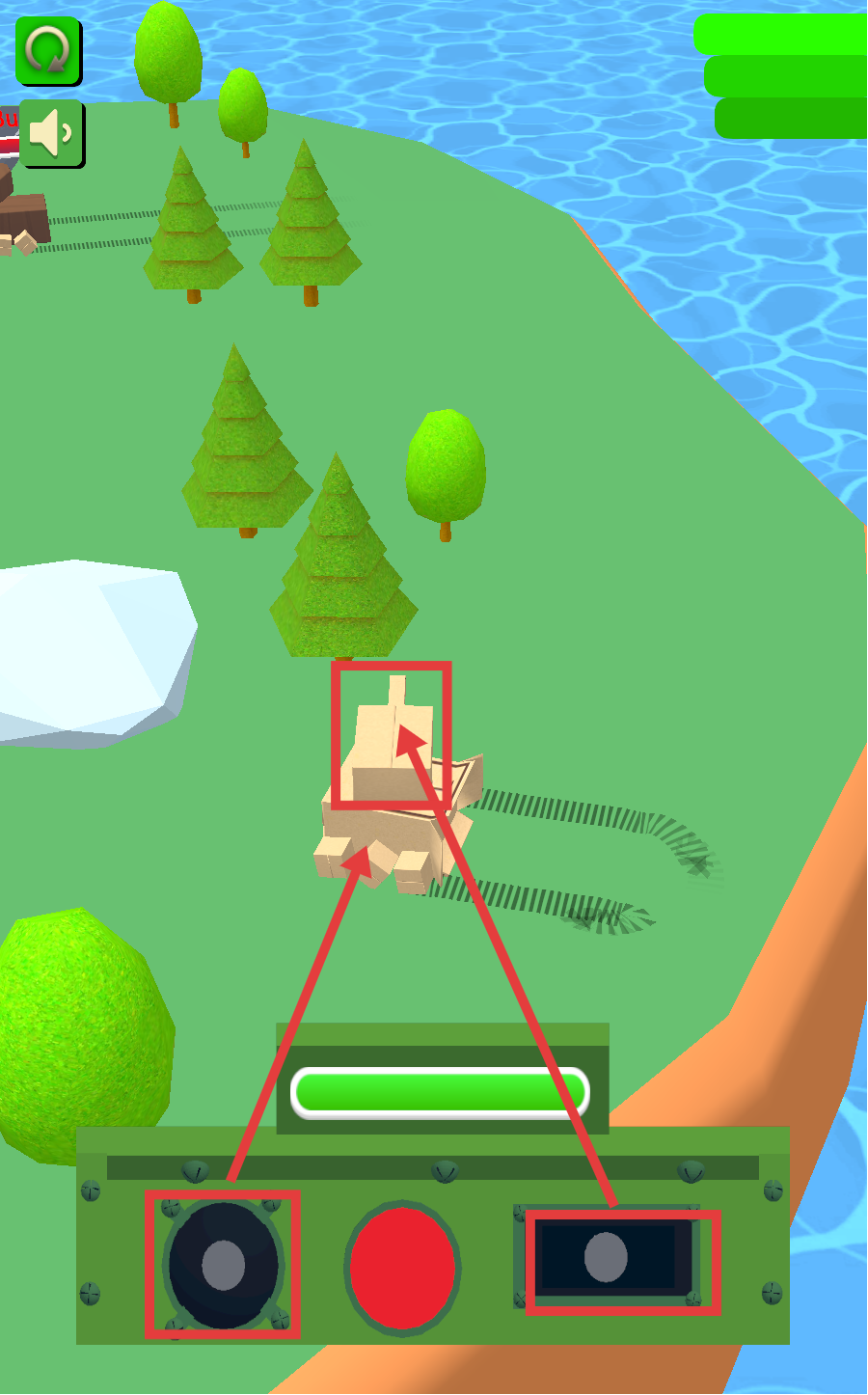 2、操作界面里,借助【喇叭】【磁带】功能,驱动纸板组件,推进战车组装进程。