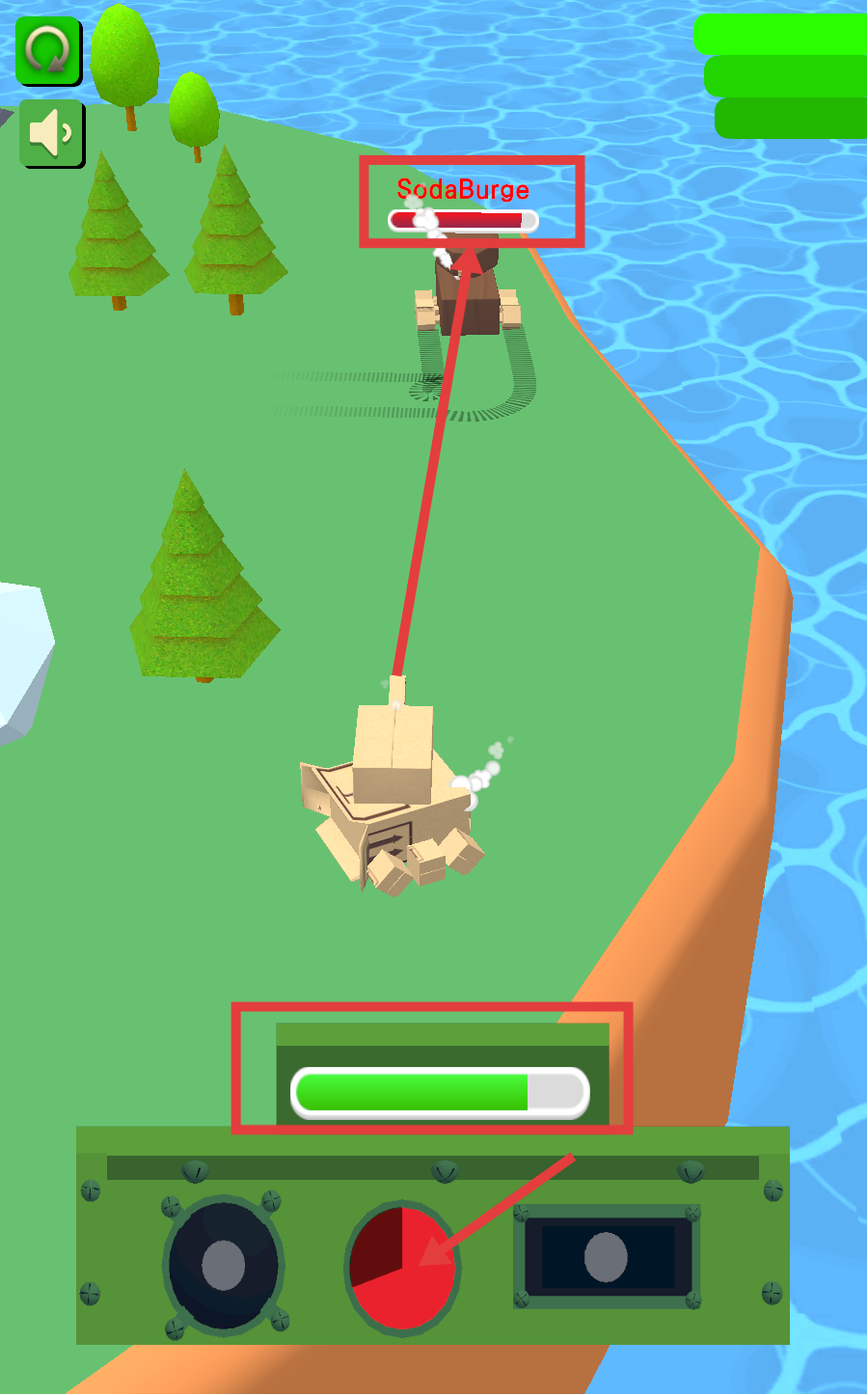 3、对战阶段,瞄准【SodaBurge】,攒满绿色进度条,按下红钮释放强力攻击破敌。