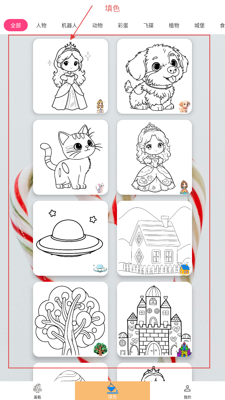 1、进入填色页,选喜欢的图案(如飞碟、公主等),点击开始填色。