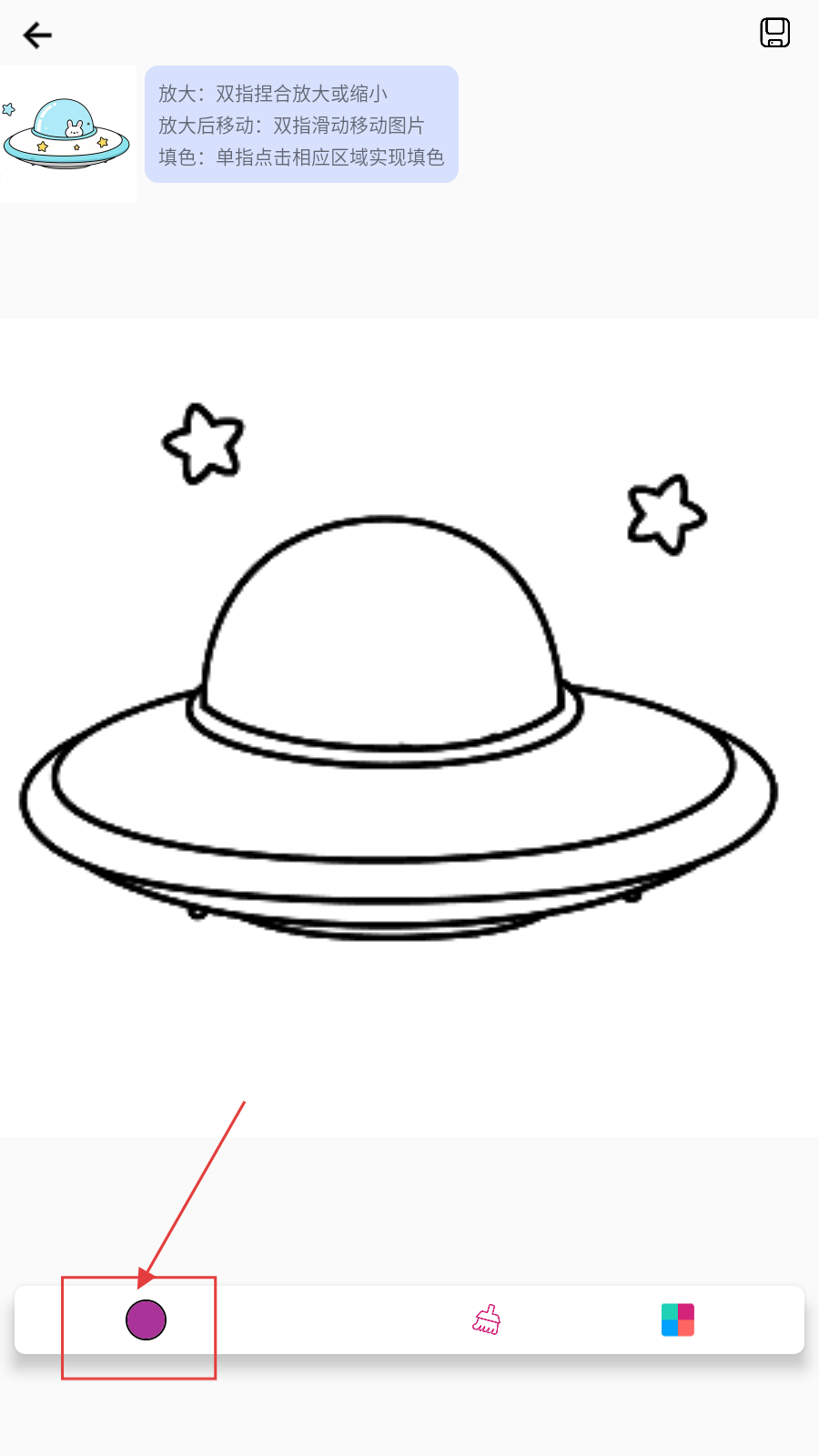 2、选好颜色(底部色盘选色),单指点击图案区域填色,双指捏合放大/缩小图案。
