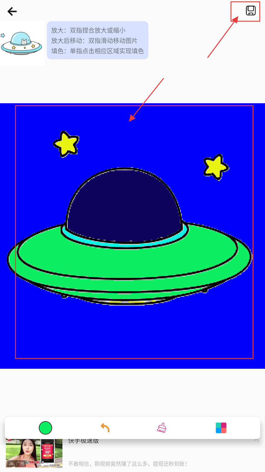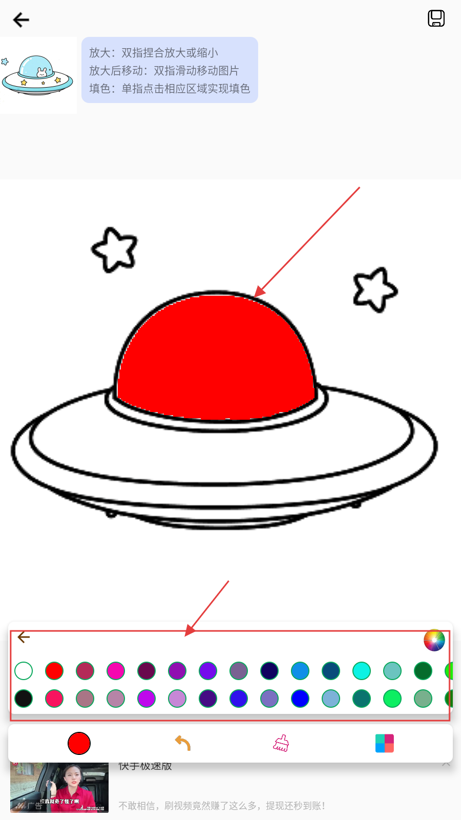 3、若填错,用底部【刷子】工具调整,还可切换色盘选不同颜色丰富画面。