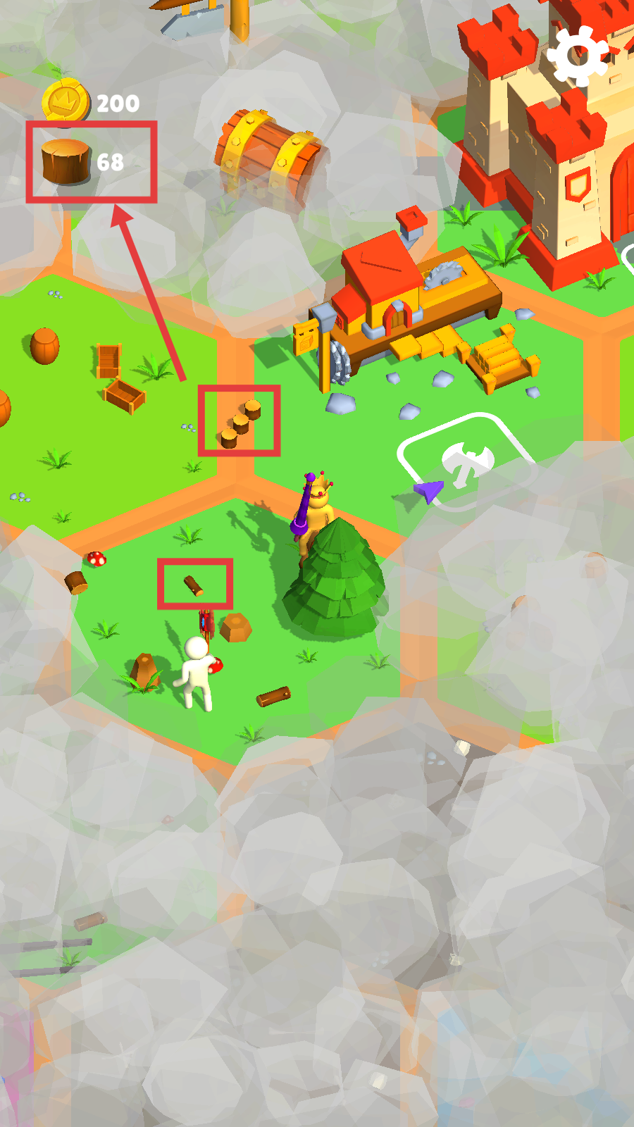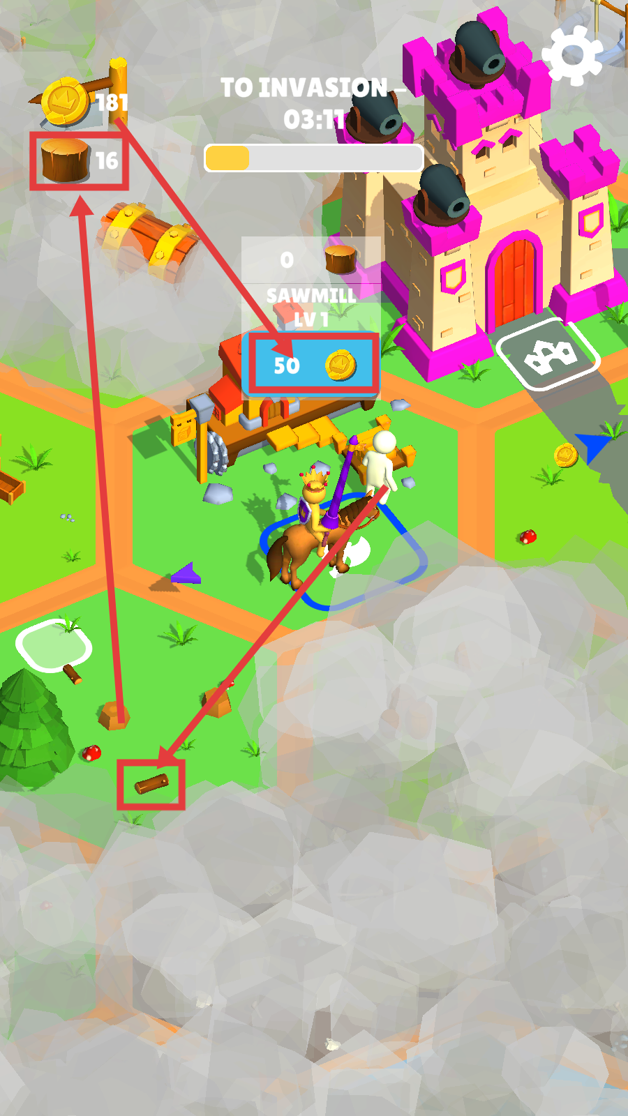 4、花费50金币升级【SAWMILL-LV1】,提升木材加工效率,配合【树桩-16】合理利用资源。