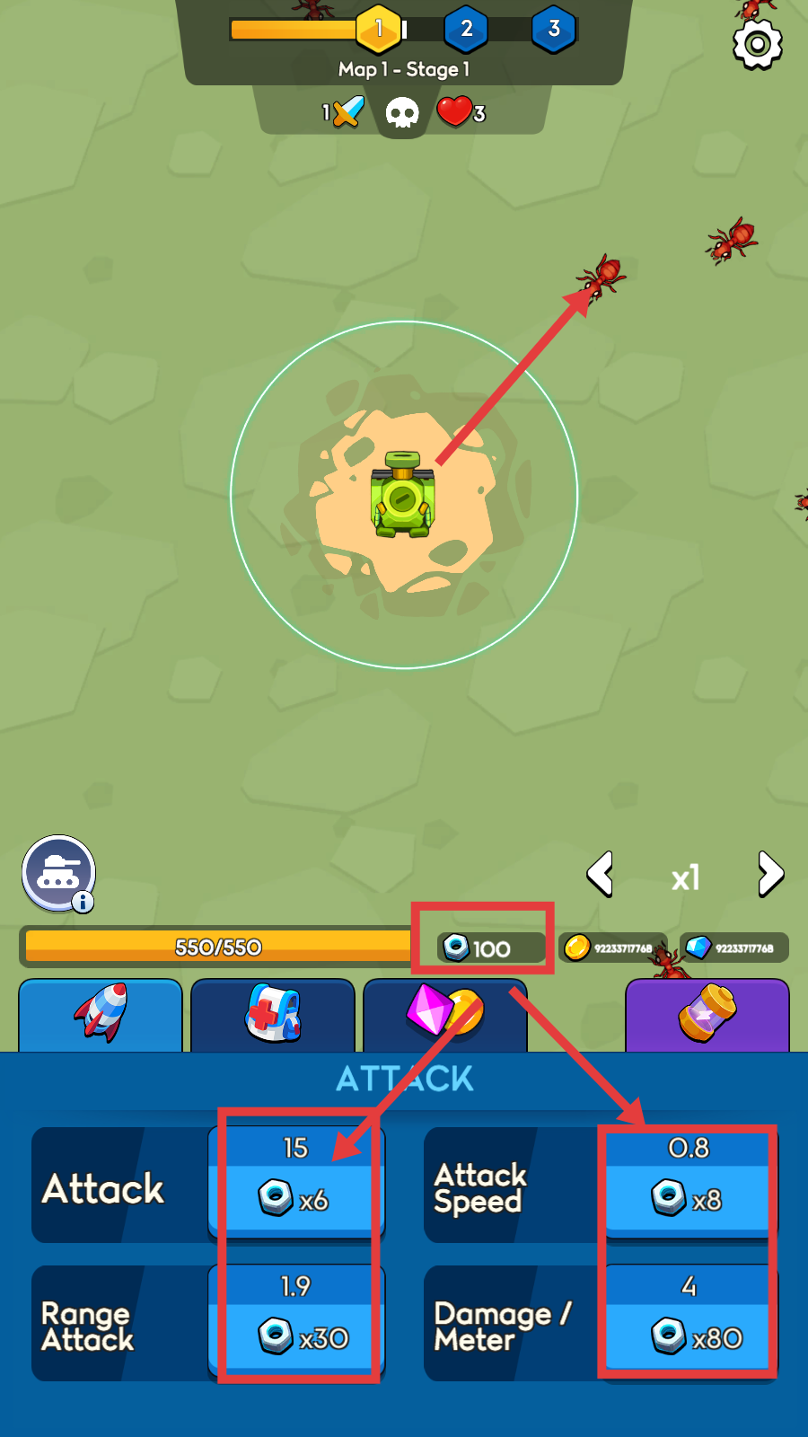 2、战斗时消耗【100-资源】,升级【Attack-15-x6】等属性,强化坦克抵御红蚁进攻。