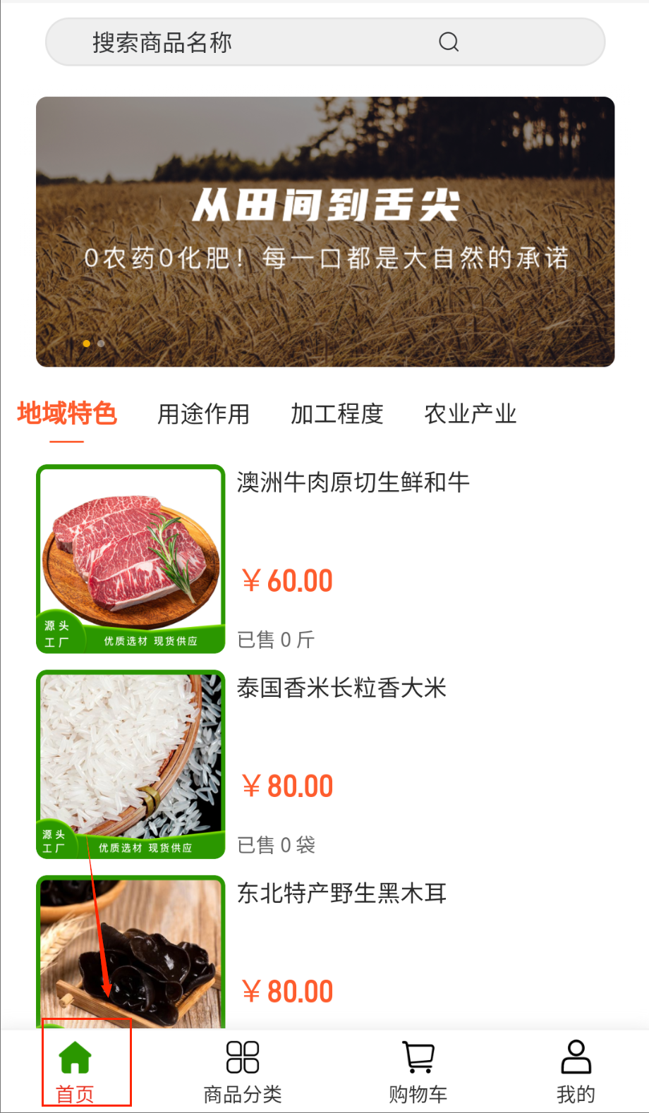 2、在首页浏览推荐商品或通过分类查找目标农产品,点击商品查看详细参数和产地信息确认品质。