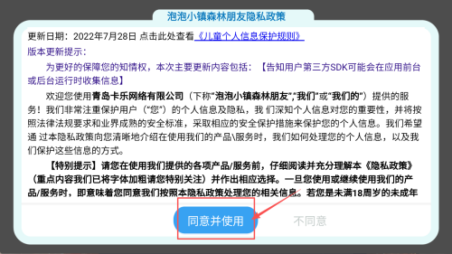 1、阅读“泡泡小镇森林朋友隐私政策”,点击“同意并使用”,正式开启游戏。