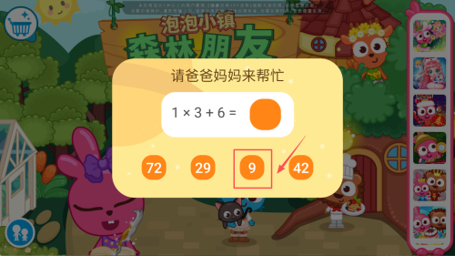 2、看到“请爸爸妈妈来帮忙”页面,让大人完成1×3+6=9的验证后点击“29”进入下一步。