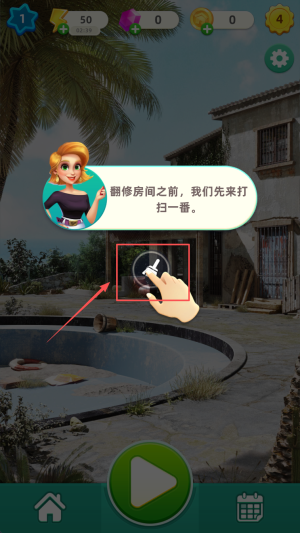 1、点击“50”关卡提示,阅读“翻修房间之前,我们先来打扫一番”,了解任务目标。
