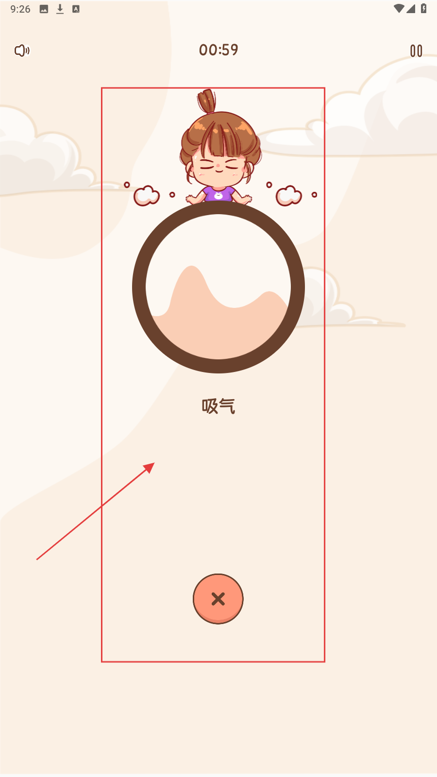 3、参与呼吸练习,依页面“吸气”提示和时间轴,沉浸式进行呼吸养生操作。