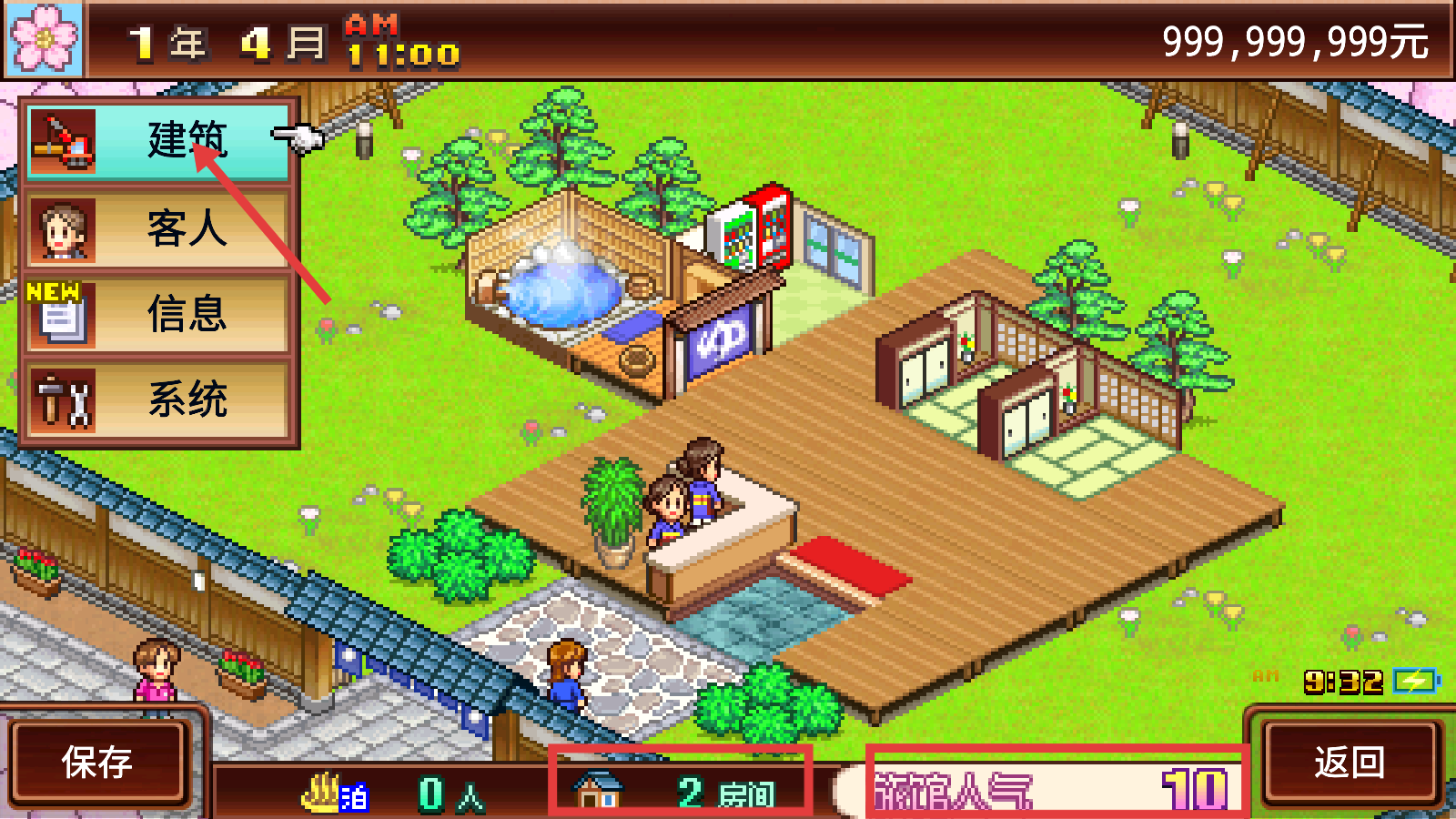 1、1年4月-AM11:00,点击【建筑】规划布局,扩充【2房间】规模,夯实运营基础。