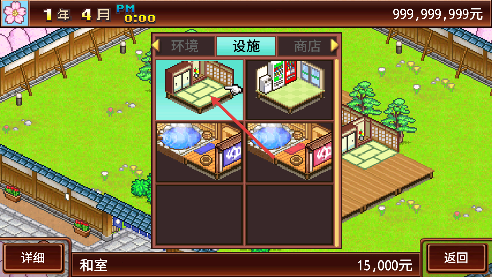 2、设施界面中,花费15,000元购置【和室】,丰富住宿类型,拓展客群选择。