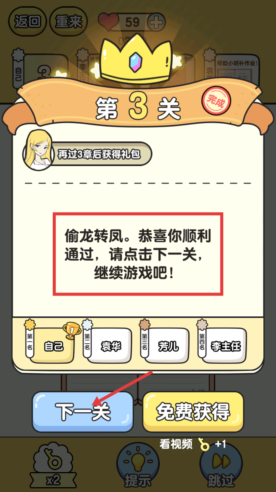 4、第3关通关后,点击【下一关】按钮,继续解锁后续班级挑战剧情。