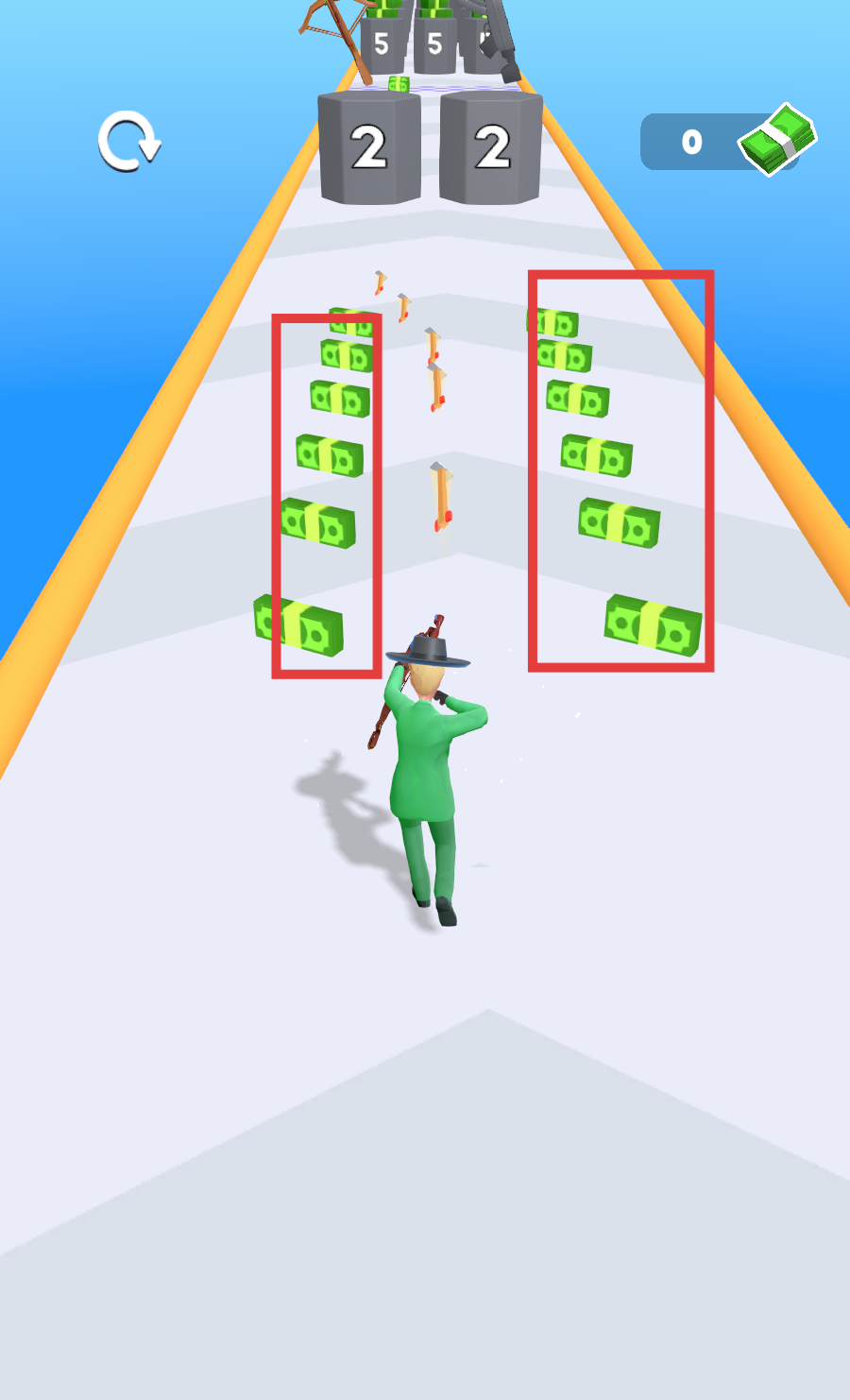 2、奔跑时瞄准两侧【绿色钞票】,左右移动角色尽可能全部收集。