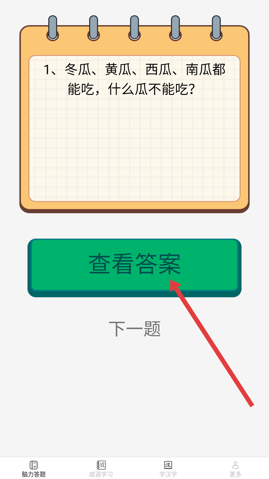1、在【脑力答题】页,遇脑筋急转弯,思考后点【查看答案】看结果。