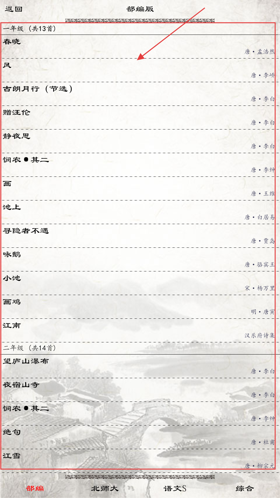 3、选对应年级教材,点击古诗标题,如【春晓】,进入详情深入了解。