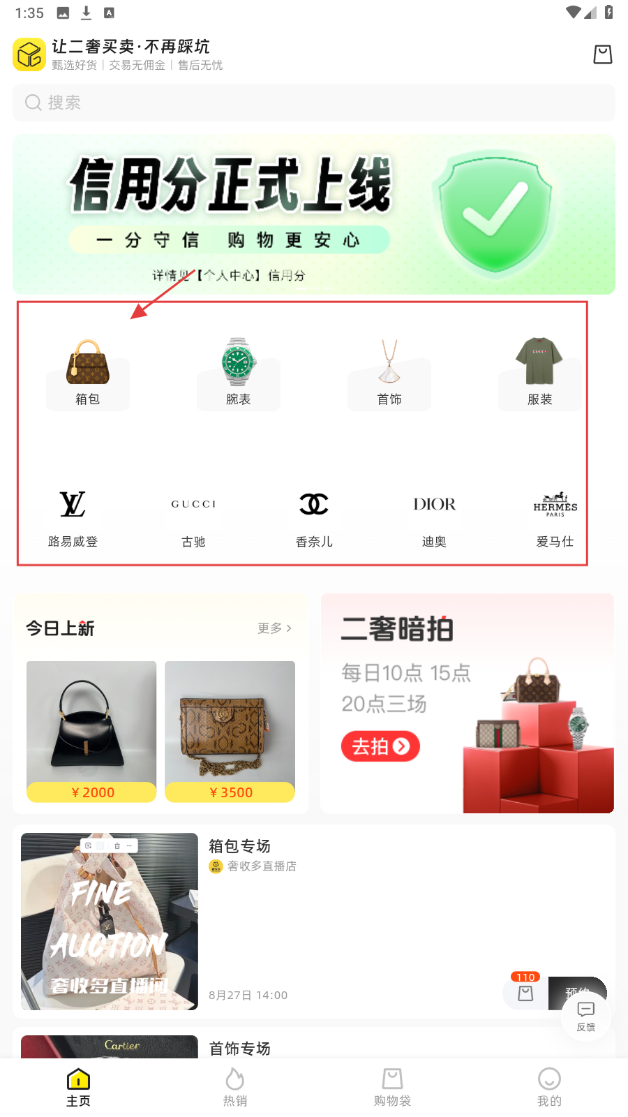 1、进入应用主页,按需选【箱包】【腕表】等分类,浏览心仪商品类别。