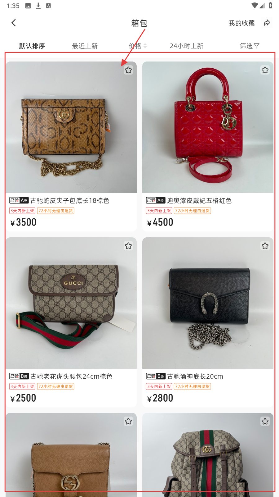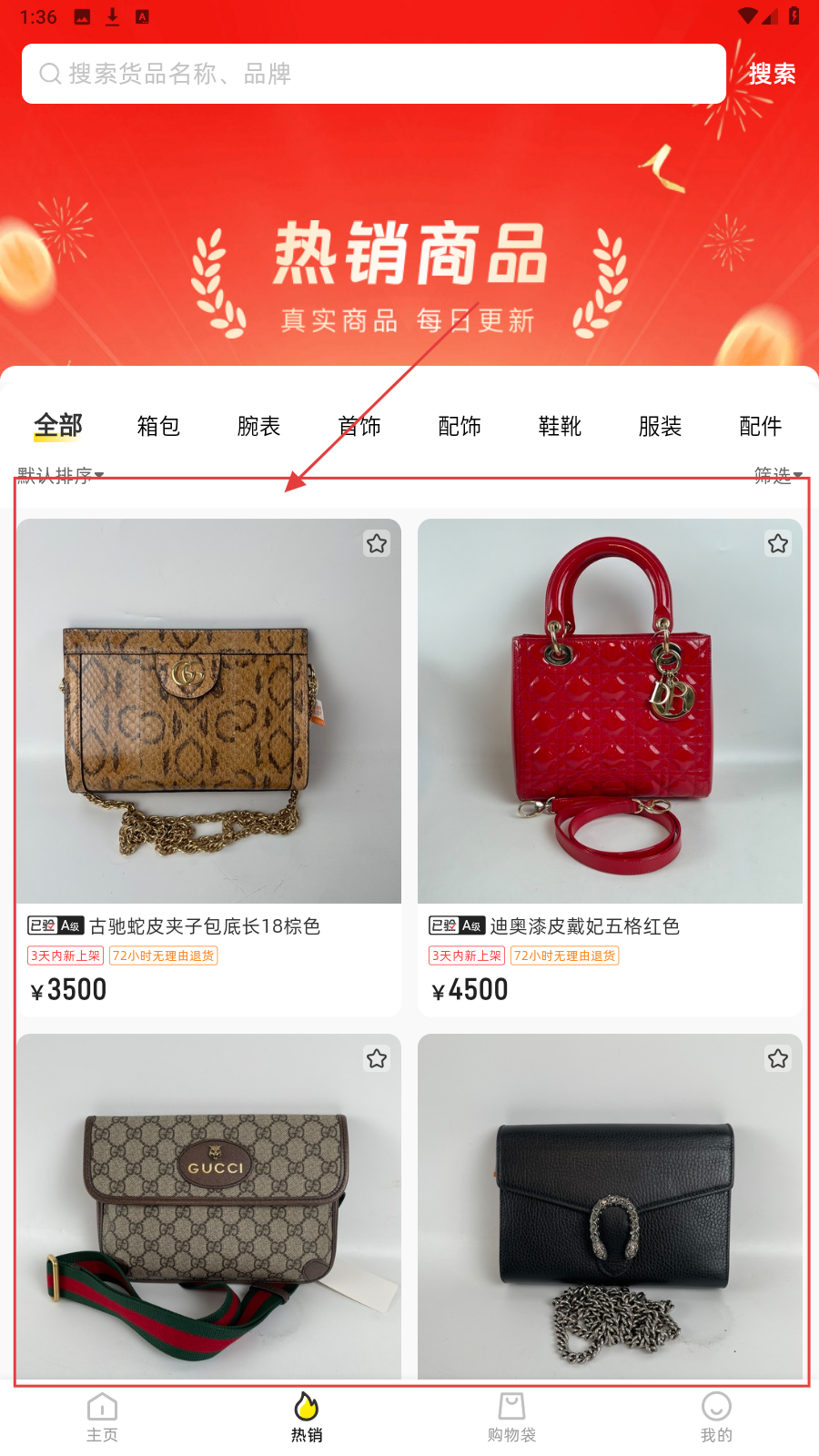 2、在分类页,如【箱包】,查看商品列表,筛选感兴趣的二手奢侈品。
