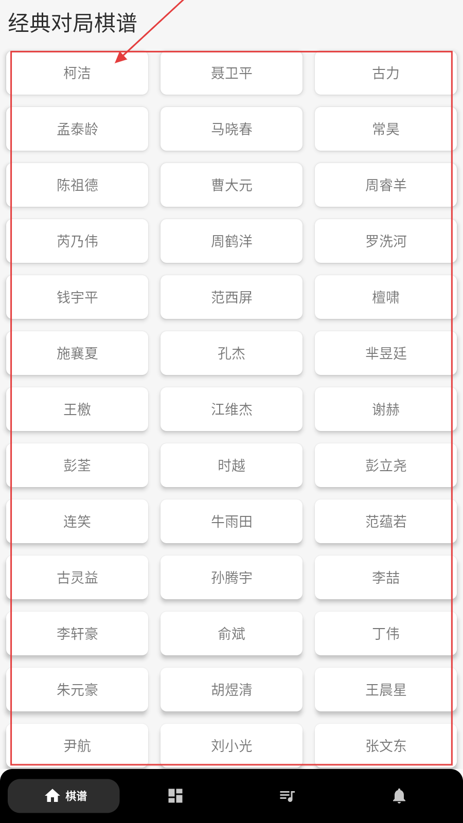1、进入应用,选【柯洁】等棋手,查看其经典对局棋谱,学习高端技法。