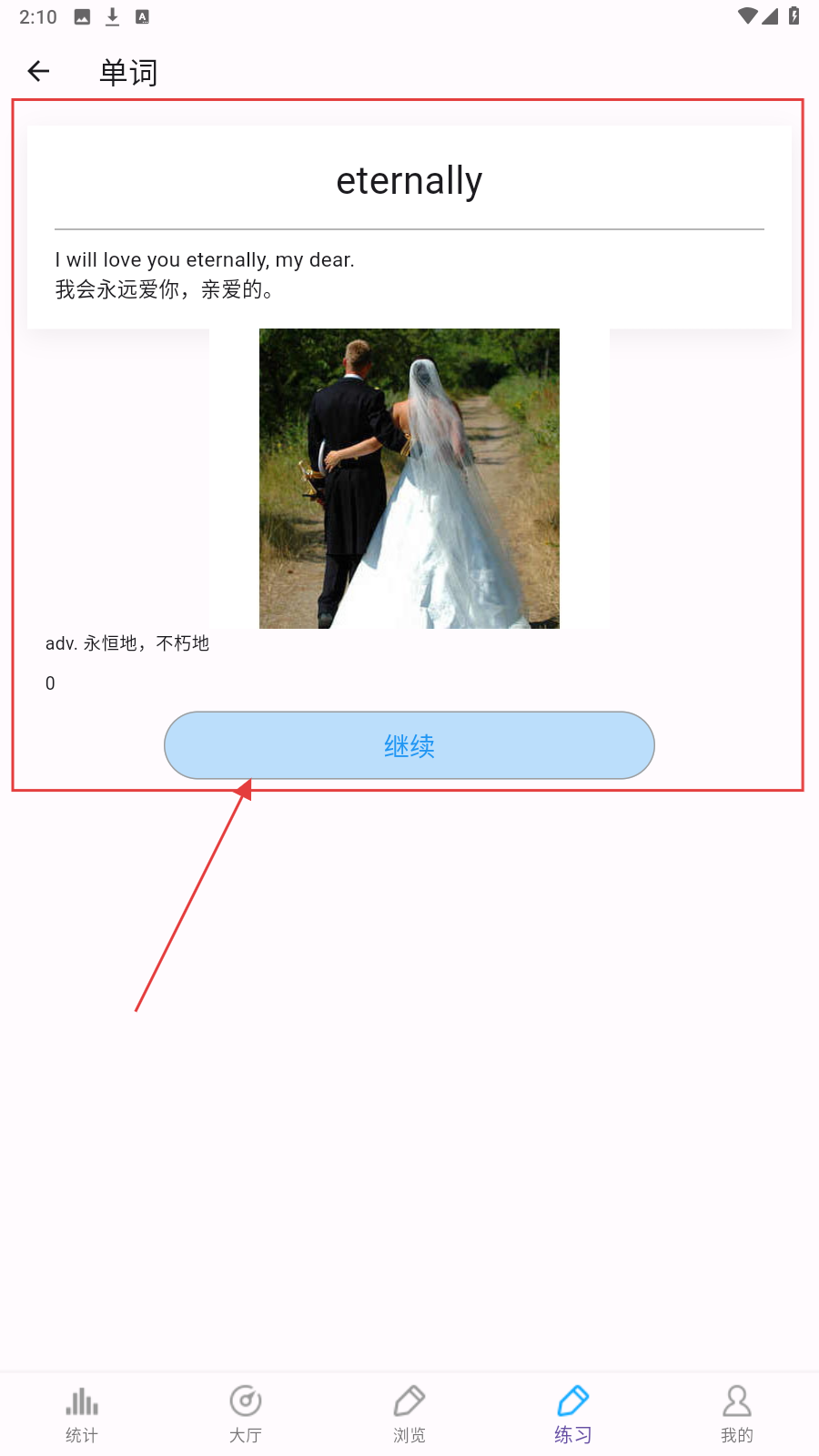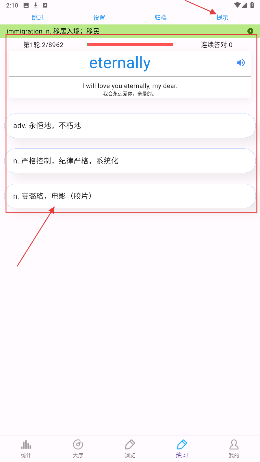 1、进入【练习】,遇单词题(如【eternally】),选正确词义,如若不会点击【提示】按钮。