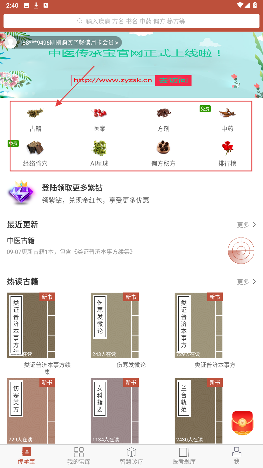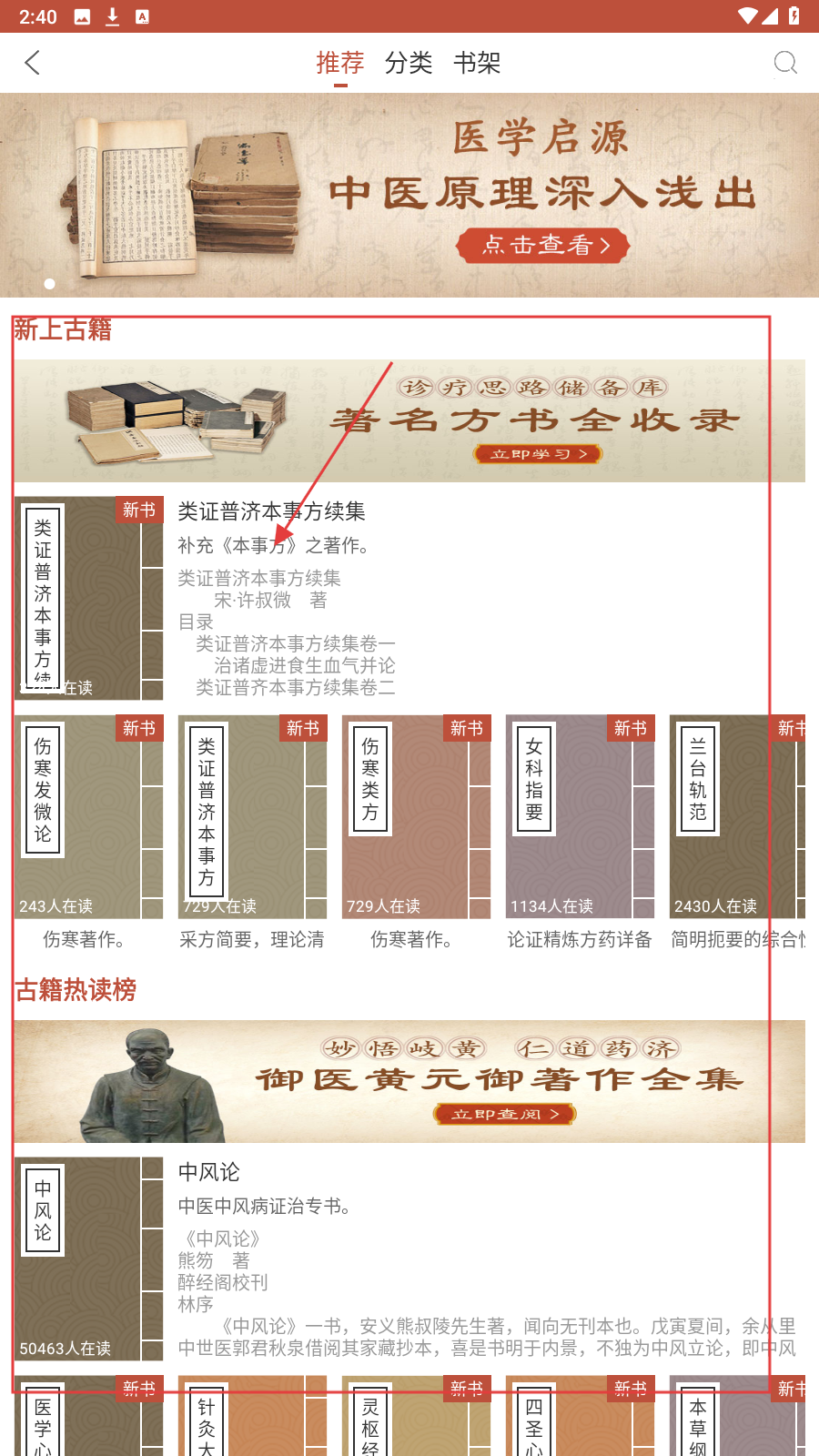 1、打开应用,选【古籍】分类,进入中医典籍学习板块。