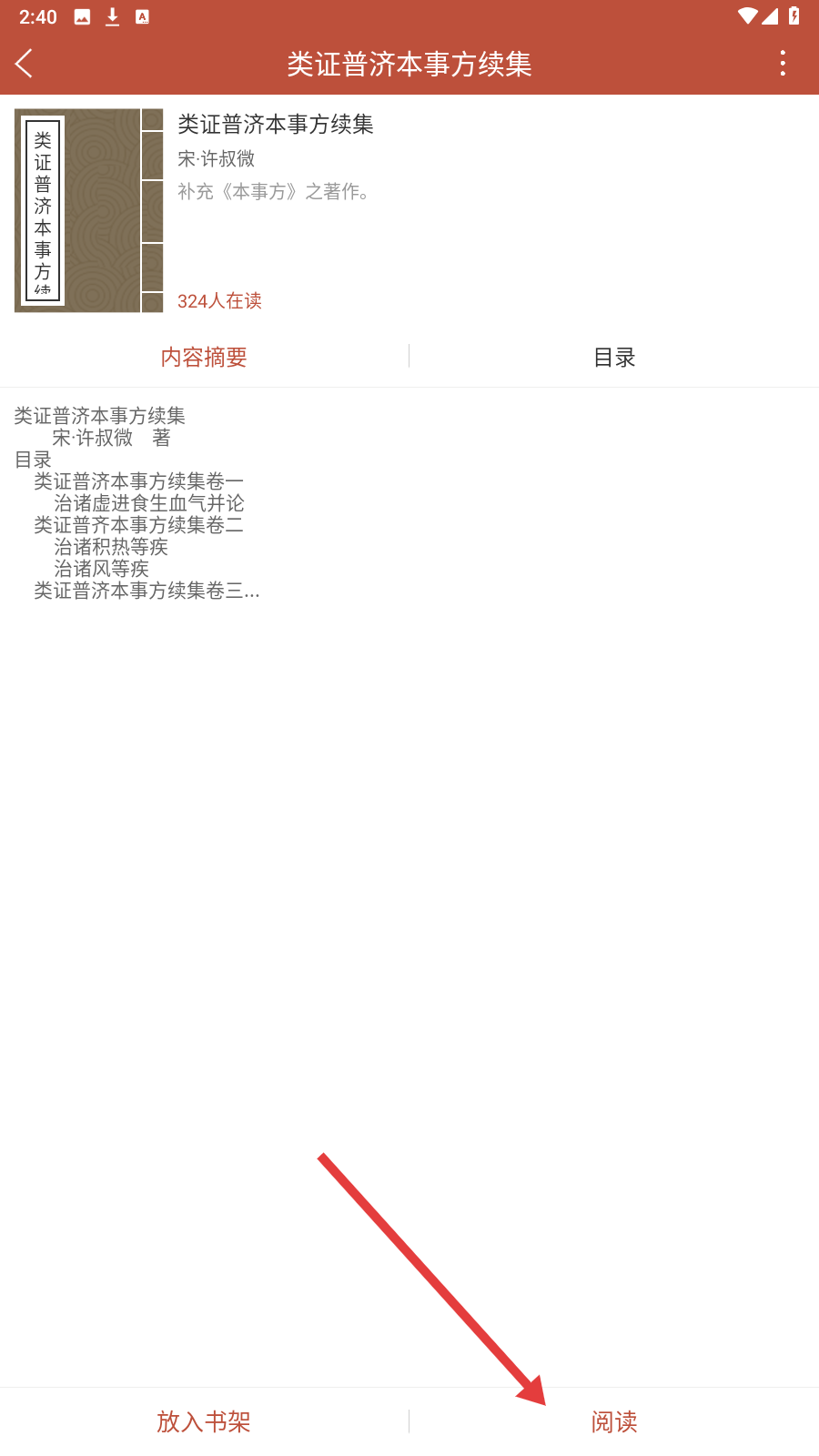 3、详情页点【阅读】,进入阅读模式,浏览古籍内容学中医知识。